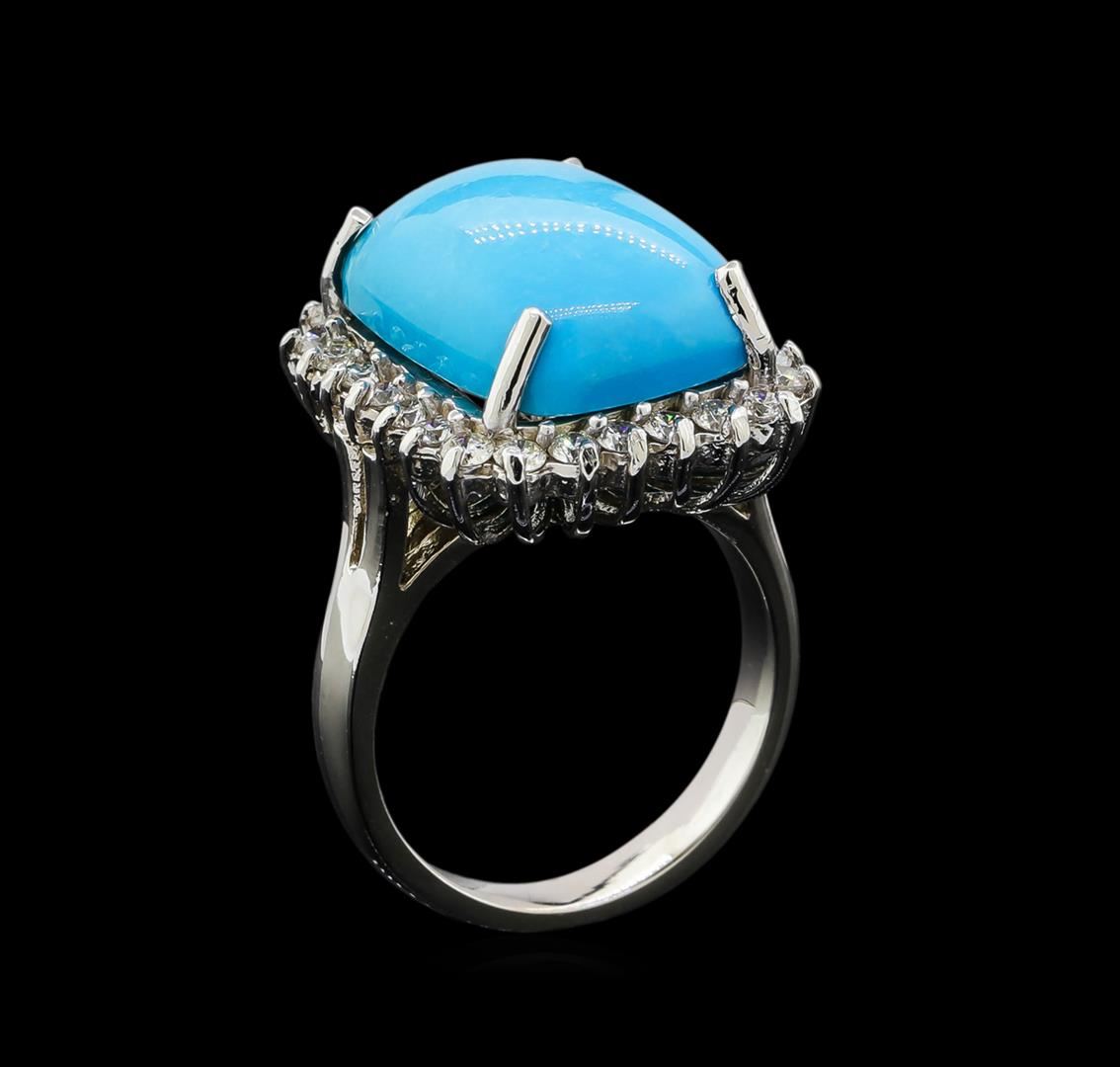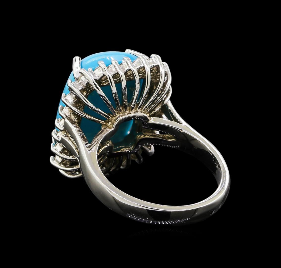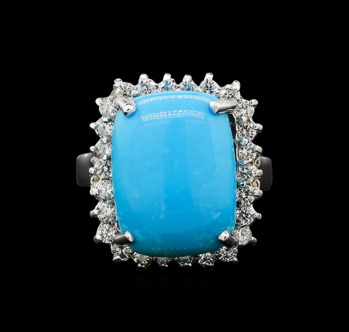 One electronically tested 14KT white gold ladies cast turquoise and diamond ring with a bright polish finish. Identified with markings of "14K". Condition is new. Containing: One prong set rectangular cabochon cut natural turquoise, measuring 15.85 x 12.00 x 6.20mm, approximate weight of 8.79ct., clarity is heavily included, medium light, moderately strong, blue color, (GIA B 4/4), cut is good. Twenty-Six prong set round brilliant cut diamonds, measuring 1.90 - 1.90 x 1.14mm (depth est.) approximate total weight of 26 Stones = 0.65ct. Clarity: SI-1 to SI-2. Color: I - J, Cut is Good. Colored gemstones are presumed to have been subjected to commonly used enhancement processes. All diamonds and colored gemstones are graded in the mounting, unless otherwise stated. Total Weight of Colored Stones 8.79ct. Total Weight of Diamonds 0.65ct. Total Weight of Ring 8.90 grams. GGL Appraised.
