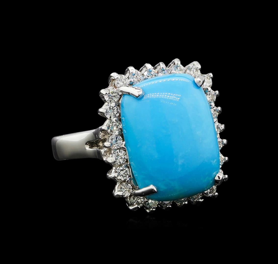 One electronically tested 14KT white gold ladies cast turquoise and diamond ring with a bright polish finish. Identified with markings of "14K". Condition is new. Containing: One prong set rectangular cabochon cut natural turquoise, measuring 15.85 x 12.00 x 6.20mm, approximate weight of 8.79ct., clarity is heavily included, medium light, moderately strong, blue color, (GIA B 4/4), cut is good. Twenty-Six prong set round brilliant cut diamonds, measuring 1.90 - 1.90 x 1.14mm (depth est.) approximate total weight of 26 Stones = 0.65ct. Clarity: SI-1 to SI-2. Color: I - J, Cut is Good. Colored gemstones are presumed to have been subjected to commonly used enhancement processes. All diamonds and colored gemstones are graded in the mounting, unless otherwise stated. Total Weight of Colored Stones 8.79ct. Total Weight of Diamonds 0.65ct. Total Weight of Ring 8.90 grams. GGL Appraised.