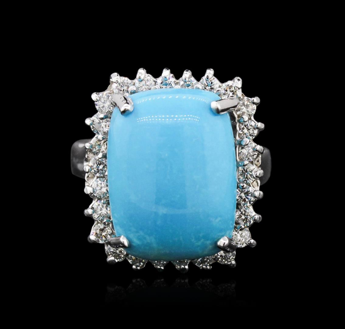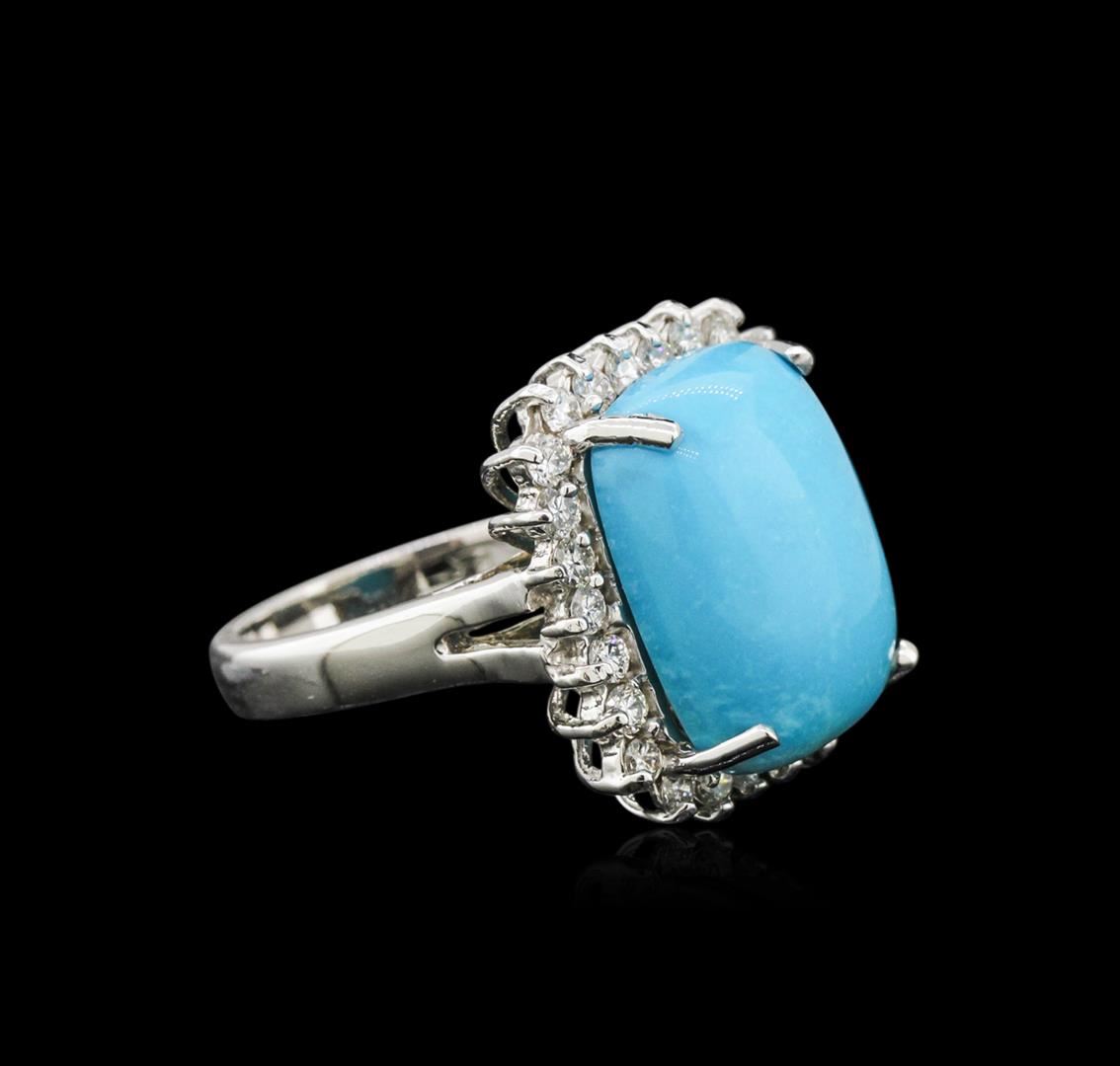 One electronically tested 14KT white gold ladies cast turquoise and diamond ring with a bright polish finish. Identified with markings of "14K". Condition is new. Containing: One prong set rectangular cabochon cut natural turquoise, measuring 15.85 x 12.00 x 6.20mm, approximate weight of 8.79ct., clarity is heavily included, medium light, moderately strong, blue color, (GIA B 4/4), cut is good. Twenty-Six prong set round brilliant cut diamonds, measuring 1.90 - 1.90 x 1.14mm (depth est.) approximate total weight of 26 Stones = 0.65ct. Clarity: SI-1 to SI-2. Color: I - J, Cut is Good. Colored gemstones are presumed to have been subjected to commonly used enhancement processes. All diamonds and colored gemstones are graded in the mounting, unless otherwise stated. Total Weight of Colored Stones 8.79ct. Total Weight of Diamonds 0.65ct. Total Weight of Ring 8.90 grams. GGL Appraised at $3,170.00.