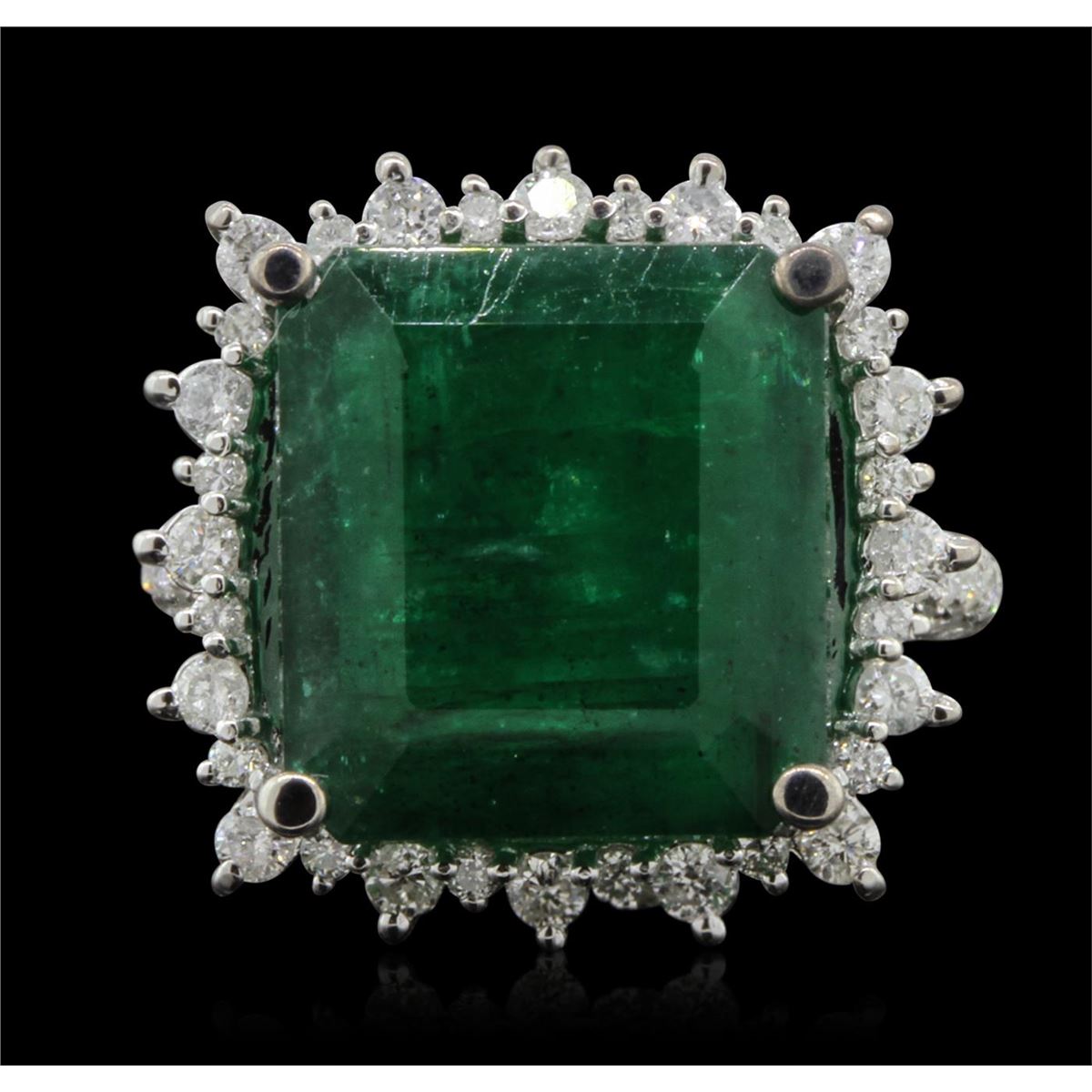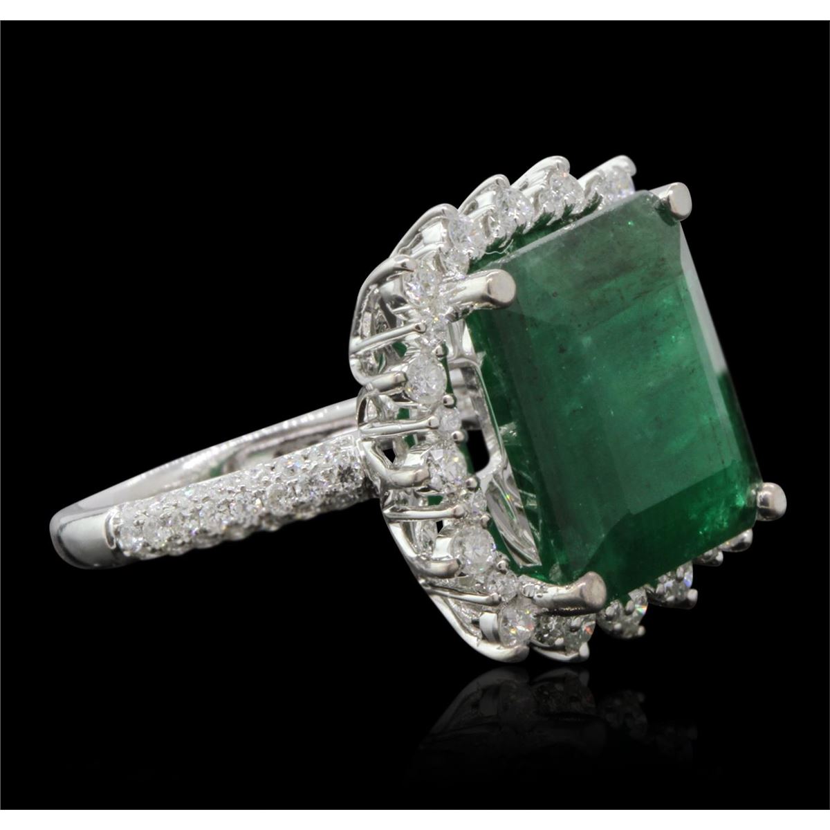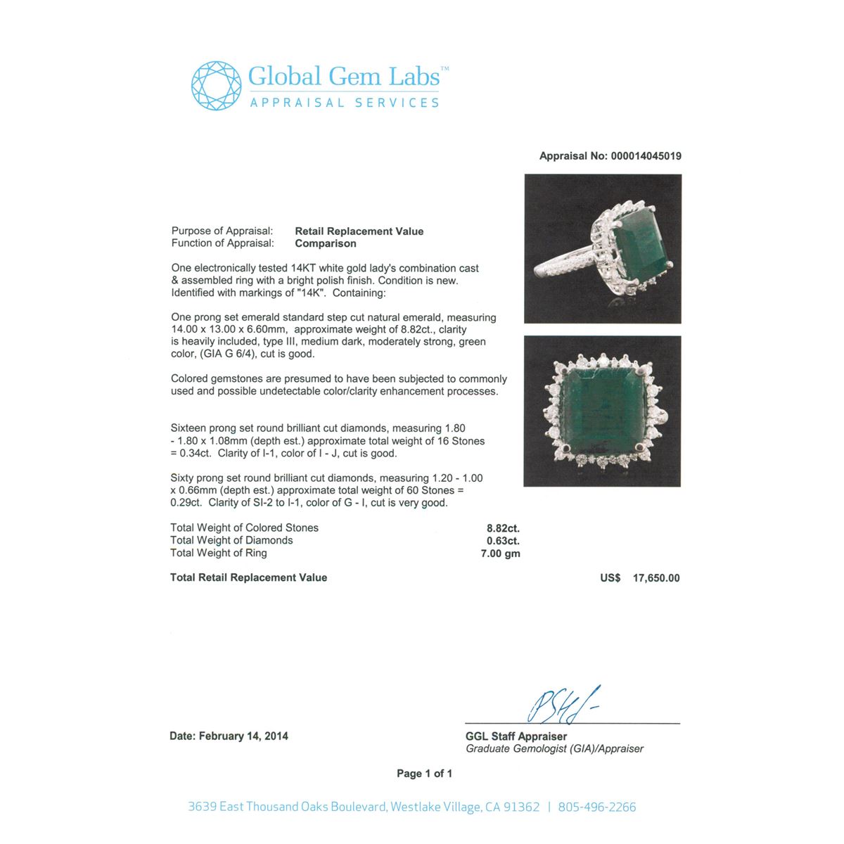 One electronically tested 14KT white gold Ladies combination cast & assembled ring with a bright polish finish. Condition is new. Identified with markings of "14K". Containing: One prong set emerald standard step cut natural emerald, measuring 14.00 x 13.00 x 6.60mm, approximate weight of 8.82ct., clarity is heavily included, type III, medium dark, moderately strong, green color, (GIA G 6/4), cut is good. Colored gemstones are presumed to have been subjected to commonly used and possible undetectable color/clarity enhancement processes. Sixteen prong set round brilliant cut diamonds, measuring 1.80 - 1.80 x 1.08mm (depth est.) approximate total weight of 16 Stones = 0.34ct. Clarity of I-1, Color of I - J, Cut is Good. Sixty prong set round brilliant cut diamonds, measuring 1.20 - 1.00 x 0.66mm (depth est.) approximate total weight of 60 Stones = 0.29ct. Clarity of SI-2 to I-1, Color of G - I, Cut is Very Good. Total Weight of Colored Stones 8.82ct. Total Weight of Diamonds 0.63ct. Total Weight of Ring 7.00gm. GGL Appraised at $17,650.00.
