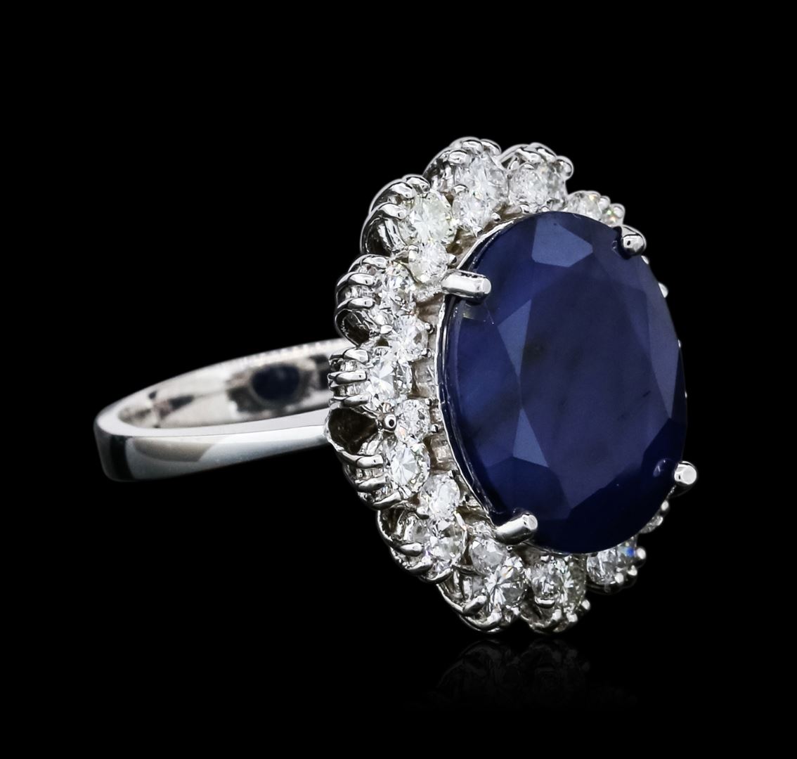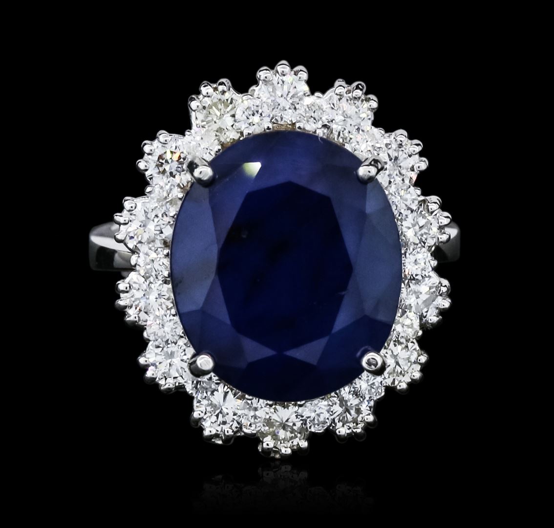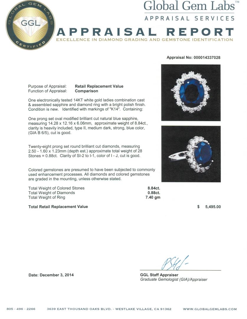 One electronically tested 14KT white gold ladies combination cast & assembled sapphire and diamond ring with a bright polish finish. Identified with markings of "K14". Condition is new. Containing: One prong set oval modified brilliant cut natural blue sapphire, measuring 14.28 x 12.16 x 6.06mm, approximate weight of 8.84ct., clarity is heavily included, type II, medium dark, strong, blue color, (GIA B 6/5), cut is good. Twenty-Eight prong set round brilliant cut diamonds, measuring 2.50 - 1.60 x 1.23mm (depth est.) approximate total weight of 28 Stones = 0.88ct. Clarity: SI-2 to I-1. Color: I - J, Cut is Good. Colored gemstones are presumed to have been subjected to commonly used enhancement processes. All diamonds and colored gemstones are graded in the mounting, unless otherwise stated. Total Weight of Colored Stones 8.84ct. Total Weight of Diamonds 0.88ct. Total Weight of Ring 7.40 grams. GGL Appraised at $5,495.00.