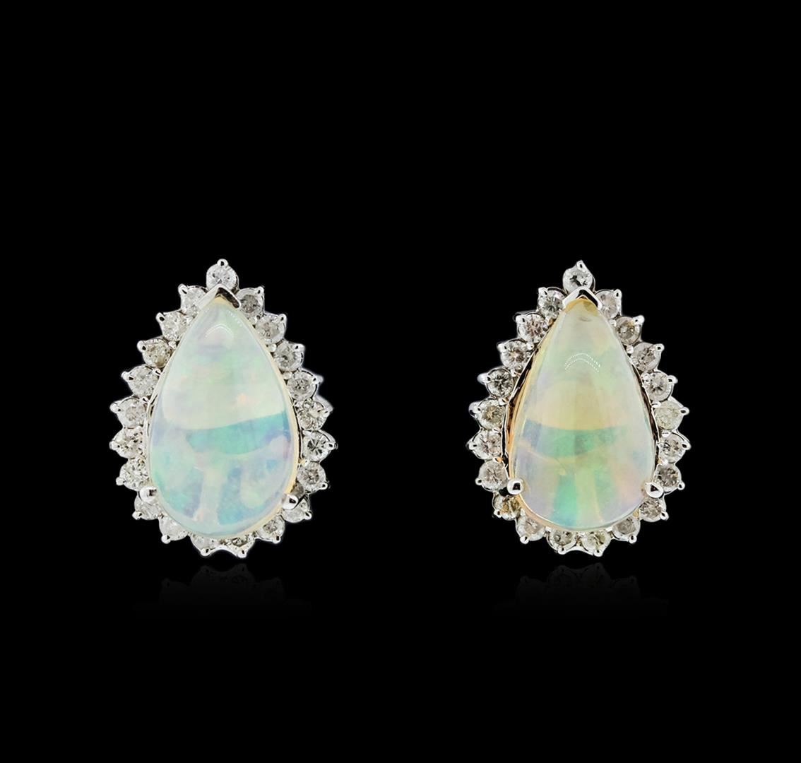 One polished, stamped, and tested pair of 14K white gold earrings mounted with: 2 genuine opal center stones weighing 8.89 carats, and 42 genuine round diamonds weighing 1.34 carats. This item weighs 7.4 grams, condition is new, excellent workmanship. MAIN GEMSTONES: Identity: Natural Opal. Species: Opal. Shape: Pear. Cutting Style: Cabochon. Quantity: 2 Opals. Measurements: 16.6 x 10.2 mm 15.9 x 9.8 mm. Total Weight: 8.89 carats. Phenomenon: Play of Color. Cut Grade: Excellent. Refractive Index: 1.450 (+0.020/-0.080). Birefringence: None. ADJACENT GEMSTONES ON EARRINGS: Identity: Natural Diamond. Cut: Round. Cutting Style: Brilliant. Quantity: 42 Diamonds. Measurements: 2.0 mm. Total Weight: 1.34 carats. Clarity Grade: SI2 - I1. Color Grade: G - I. Refractive Index: 2.418. Hardness: 10. Total Opal Weight: 8.89 cts. Total Diamond Weight: 1.34 cts. Weight of Item: 7.4 grams. Gold Content: 14K White Gold. AIGL Appraised at $10,180.00.