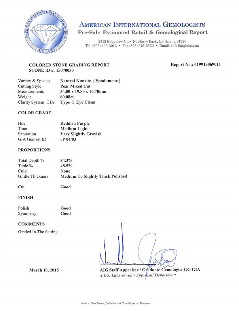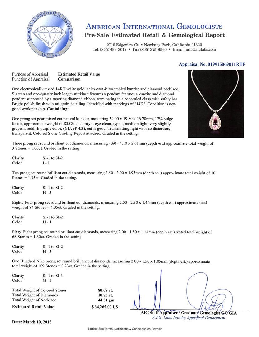 One electronically tested 14KT white gold ladies cast & assembled kunzite and diamond necklace. Sixteen and one-quarter inch length necklace features a pendant features a kunzite and diamond pendant supported by a tapering diamond ribbon, terminating in a concealed clasp with safety bar. Bright polish finish with milgrain detailing. Identified with markings of "14K". Condition is new, good workmanship. Containing: One prong set pear mixed cut natural kunzite, measuring 34.00 x 19.80 x 16.70mm, 12% bulge factor, approximate weight of 80.08ct., clarity is eye clean, type I, medium light, very slightly grayish, reddish purple color, (GIA rP 4/3), cut is good. Transmitting light with no distortion, transparent. Colored Stone Grading Report attached. Graded in the setting. Three prong set round brilliant cut diamonds, measuring 4.60 - 4.10 x 2.61mm (depth est.) approximate total weight of 3 Stones = 1.00ct. Graded in the setting. Clarity: SI-1 to SI-2. Color: I - J Ten prong set round brilliant cut diamonds, measuring 3.50 - 3.00 x 1.95mm (depth est.) approximate total weight of 10 Stones = 1.35ct. Graded in the setting. Clarity: SI-1 to SI-2. Color: H - J Eighty-Four prong set round brilliant cut diamonds, measuring 2.50 - 2.30 x 1.44mm (depth est.) approximate total weight of 84 Stones = 4.35ct. Graded in the setting. Clarity: SI-1 to SI-2. Color: H - J Sixty-Eight prong set round brilliant cut diamonds, measuring 2.00 - 1.80 x 1.14mm (depth est.) stated. Total Weight of 68 Stones = 1.80ct. Graded in the setting. Clarity: SI-1 to SI-2. Color: H - J One Hundred Nine prong set round brilliant cut diamonds, measuring 2.00 - 1.50 x 1.05mm (depth est.) approximate total weight of 109 Stones = 2.23ct. Graded in the setting. Clarity: SI-1 to SI-3. Color: G - I. Total Weight of Colored Stones 80.08ct. Total Weight of Diamonds 10.73ct. Total Weight of Necklace 44.31 grams. AIG Appraised at $64,265.00.
