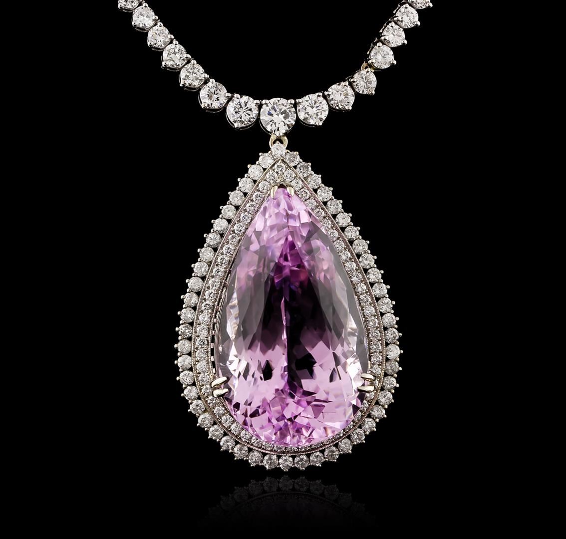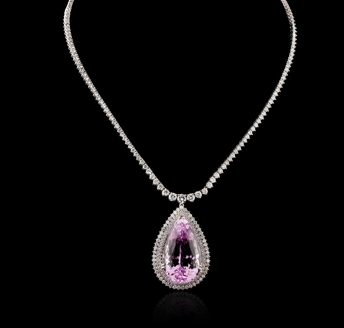 One electronically tested 14KT white gold ladies cast & assembled kunzite and diamond necklace. Sixteen and one-quarter inch length necklace features a pendant features a kunzite and diamond pendant supported by a tapering diamond ribbon, terminating in a concealed clasp with safety bar. Bright polish finish with milgrain detailing. Identified with markings of "14K". Condition is new, good workmanship. Containing: One prong set pear mixed cut natural kunzite, measuring 34.00 x 19.80 x 16.70mm, 12% bulge factor, approximate weight of 80.08ct., clarity is eye clean, type I, medium light, very slightly grayish, reddish purple color, (GIA rP 4/3), cut is good. Transmitting light with no distortion, transparent. Colored Stone Grading Report attached. Graded in the setting. Three prong set round brilliant cut diamonds, measuring 4.60 - 4.10 x 2.61mm (depth est.) approximate total weight of 3 Stones = 1.00ct. Graded in the setting. Clarity: SI-1 to SI-2. Color: I - J Ten prong set round brilliant cut diamonds, measuring 3.50 - 3.00 x 1.95mm (depth est.) approximate total weight of 10 Stones = 1.35ct. Graded in the setting. Clarity: SI-1 to SI-2. Color: H - J Eighty-Four prong set round brilliant cut diamonds, measuring 2.50 - 2.30 x 1.44mm (depth est.) approximate total weight of 84 Stones = 4.35ct. Graded in the setting. Clarity: SI-1 to SI-2. Color: H - J Sixty-Eight prong set round brilliant cut diamonds, measuring 2.00 - 1.80 x 1.14mm (depth est.) stated. Total Weight of 68 Stones = 1.80ct. Graded in the setting. Clarity: SI-1 to SI-2. Color: H - J One Hundred Nine prong set round brilliant cut diamonds, measuring 2.00 - 1.50 x 1.05mm (depth est.) approximate total weight of 109 Stones = 2.23ct. Graded in the setting. Clarity: SI-1 to SI-3. Color: G - I. Total Weight of Colored Stones 80.08ct. Total Weight of Diamonds 10.73ct. Total Weight of Necklace 44.31 grams. AIG Appraised at $64,265.00.