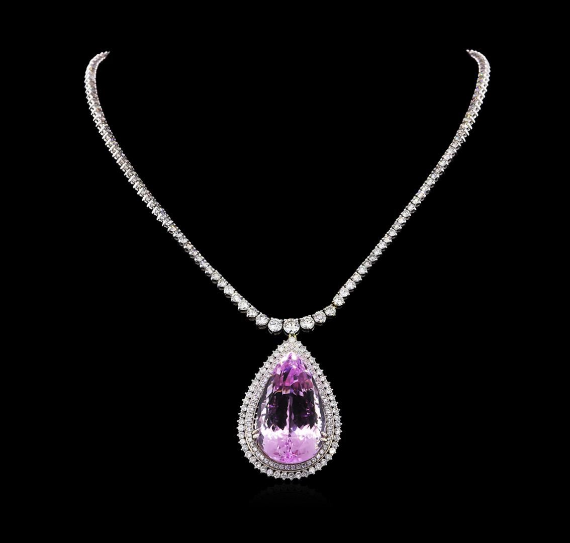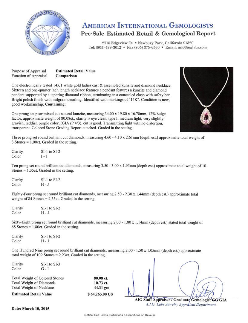 One electronically tested 14KT white gold ladies cast & assembled kunzite and diamond necklace. Sixteen and one-quarter inch length necklace features a pendant features a kunzite and diamond pendant supported by a tapering diamond ribbon, terminating in a concealed clasp with safety bar. Bright polish finish with milgrain detailing. Identified with markings of "14K". Condition is new, good workmanship. Containing: One prong set pear mixed cut natural kunzite, measuring 34.00 x 19.80 x 16.70mm, 12% bulge factor, approximate weight of 80.08ct., clarity is eye clean, type I, medium light, very slightly grayish, reddish purple color, (GIA rP 4/3), cut is good. Transmitting light with no distortion, transparent. Colored Stone Grading Report attached. Graded in the setting. Three prong set round brilliant cut diamonds, measuring 4.60 - 4.10 x 2.61mm (depth est.) approximate total weight of 3 Stones = 1.00ct. Graded in the setting. Clarity: SI-1 to SI-2. Color: I - J Ten prong set round brilliant cut diamonds, measuring 3.50 - 3.00 x 1.95mm (depth est.) approximate total weight of 10 Stones = 1.35ct. Graded in the setting. Clarity: SI-1 to SI-2. Color: H - J Eighty-Four prong set round brilliant cut diamonds, measuring 2.50 - 2.30 x 1.44mm (depth est.) approximate total weight of 84 Stones = 4.35ct. Graded in the setting. Clarity: SI-1 to SI-2. Color: H - J Sixty-Eight prong set round brilliant cut diamonds, measuring 2.00 - 1.80 x 1.14mm (depth est.) stated. Total Weight of 68 Stones = 1.80ct. Graded in the setting. Clarity: SI-1 to SI-2. Color: H - J One Hundred Nine prong set round brilliant cut diamonds, measuring 2.00 - 1.50 x 1.05mm (depth est.) approximate total weight of 109 Stones = 2.23ct. Graded in the setting. Clarity: SI-1 to SI-3. Color: G - I. Total Weight of Colored Stones 80.08ct. Total Weight of Diamonds 10.73ct. Total Weight of Necklace 44.31 grams. AIG Appraised at $64,265.00.