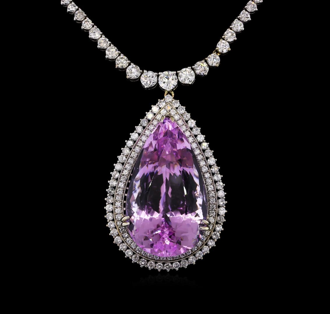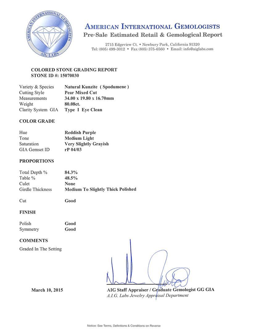 One electronically tested 14KT white gold ladies cast & assembled kunzite and diamond necklace. Sixteen and one-quarter inch length necklace features a pendant features a kunzite and diamond pendant supported by a tapering diamond ribbon, terminating in a concealed clasp with safety bar. Bright polish finish with milgrain detailing. Identified with markings of "14K". Condition is new, good workmanship. Containing: One prong set pear mixed cut natural kunzite, measuring 34.00 x 19.80 x 16.70mm, 12% bulge factor, approximate weight of 80.08ct., clarity is eye clean, type I, medium light, very slightly grayish, reddish purple color, (GIA rP 4/3), cut is good. Transmitting light with no distortion, transparent. Colored Stone Grading Report attached. Graded in the setting. Three prong set round brilliant cut diamonds, measuring 4.60 - 4.10 x 2.61mm (depth est.) approximate total weight of 3 Stones = 1.00ct. Graded in the setting. Clarity: SI-1 to SI-2. Color: I - J Ten prong set round brilliant cut diamonds, measuring 3.50 - 3.00 x 1.95mm (depth est.) approximate total weight of 10 Stones = 1.35ct. Graded in the setting. Clarity: SI-1 to SI-2. Color: H - J Eighty-Four prong set round brilliant cut diamonds, measuring 2.50 - 2.30 x 1.44mm (depth est.) approximate total weight of 84 Stones = 4.35ct. Graded in the setting. Clarity: SI-1 to SI-2. Color: H - J Sixty-Eight prong set round brilliant cut diamonds, measuring 2.00 - 1.80 x 1.14mm (depth est.) stated. Total Weight of 68 Stones = 1.80ct. Graded in the setting. Clarity: SI-1 to SI-2. Color: H - J One Hundred Nine prong set round brilliant cut diamonds, measuring 2.00 - 1.50 x 1.05mm (depth est.) approximate total weight of 109 Stones = 2.23ct. Graded in the setting. Clarity: SI-1 to SI-3. Color: G - I. Total Weight of Colored Stones 80.08ct. Total Weight of Diamonds 10.73ct. Total Weight of Necklace 44.31 grams. AIG Appraised at $64,265.00.