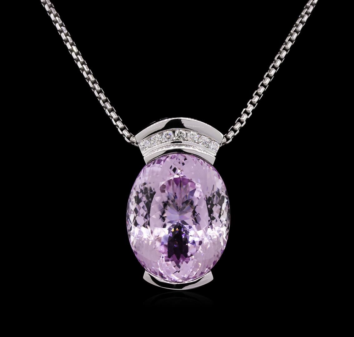 One electronically tested 14KT white gold ladies cast & assembled kunzite spodumene and diamond pendant with chain. Condition is new, good workmanship. The slide pendant features a kunzite spodumene completed by a diamond set bail. The pendant is supported by a 14KT white gold designer style chain terminating in a lobster claw clasp. Identified with markings of "14K". Containing: One channel set oval mixed cut natural kunzite, measuring 29.00 x 23.50 x 17.00mm, 8%. bulge factor, approximate weight of 80.22ct., clarity is eye clean, type I, medium light, very slightly brownish, strongly purplish red color, (GIA stpR 4/3), cut is good. Transmitting light with no distortion, transparent. Colored Stone Grading Report attached. Graded in the setting. Seven channel set round brilliant cut diamonds, measuring 2.60 - 2.60 x 1.56mm (depth est.) approximate. Total Weight of 7 Stones = 0.46ct. Graded in the setting. Clarity: SI-2 to I-1. Color: F - G. Total Weight of Colored Stones 80.22ct. Total Weight of Diamonds 0.46ct. Total Weight of Pendant With Chain 35.80 grams. AIG Appraised at $36,455.00.