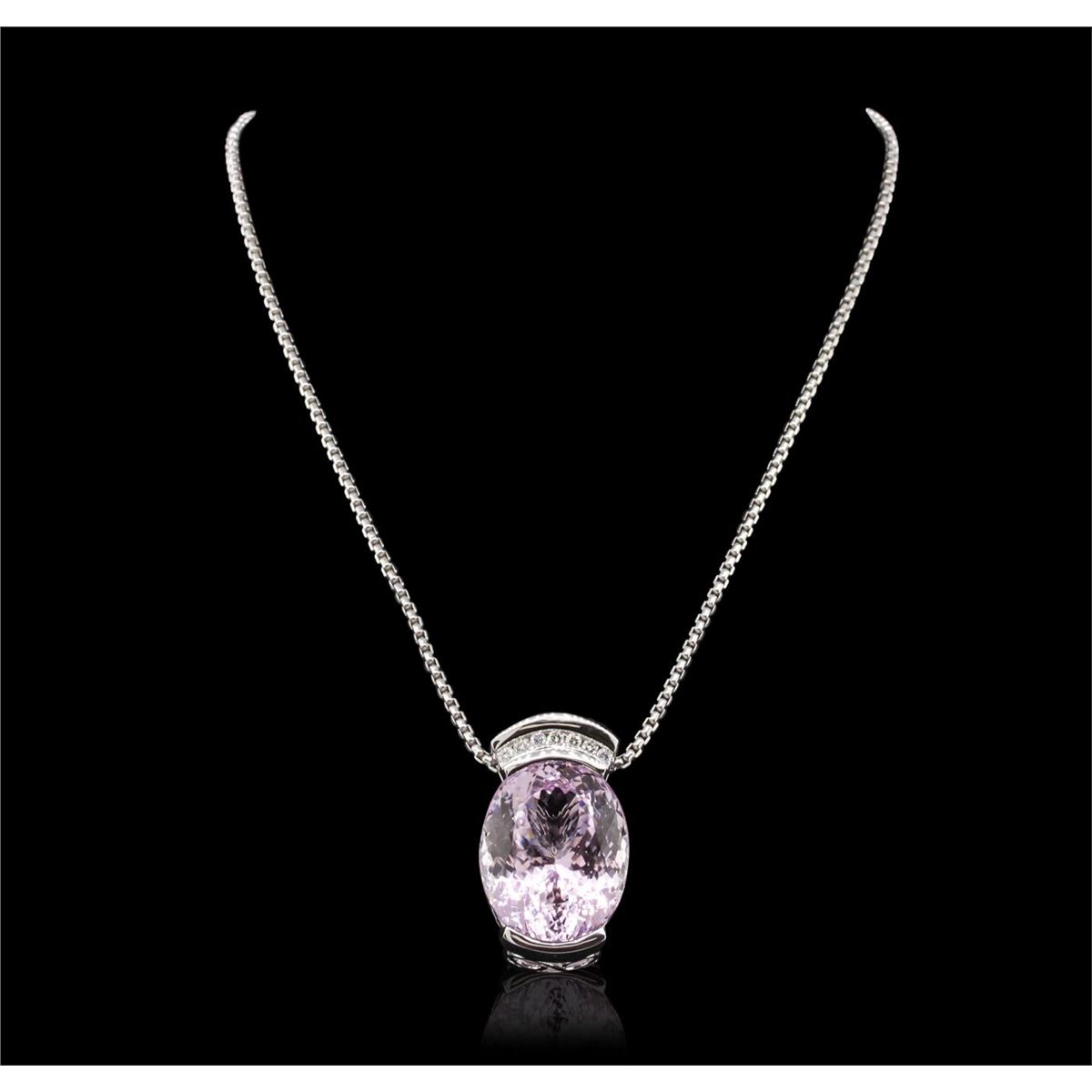 One electronically tested 14KT white gold ladies cast & assembled kunzite spodumene and diamond pendant with chain. Condition is new, good workmanship. The slide pendant features a kunzite spodumene completed by a diamond set bail. The pendant is supported by a 14KT white gold designer style chain terminating in a lobster claw clasp. Identified with markings of "14K". Containing: One channel set oval mixed cut natural kunzite, measuring 29.00 x 23.50 x 17.00mm, 8%. bulge factor, approximate weight of 80.22ct., clarity is eye clean, type I, medium light, very slightly brownish, strongly purplish red color, (GIA stpR 4/3), cut is good. Transmitting light with no distortion, transparent. Colored Stone Grading Report attached. Graded in the setting. Seven channel set round brilliant cut diamonds, measuring 2.60 - 2.60 x 1.56mm (depth est.) approximate. Total Weight of 7 Stones = 0.46ct. Graded in the setting. Clarity: SI-2 to I-1. Color: F - G. Total Weight of Colored Stones 80.22ct. Total Weight of Diamonds 0.46ct. Total Weight of Pendant With Chain 35.80 grams. AIG Appraised at $36,455.00.