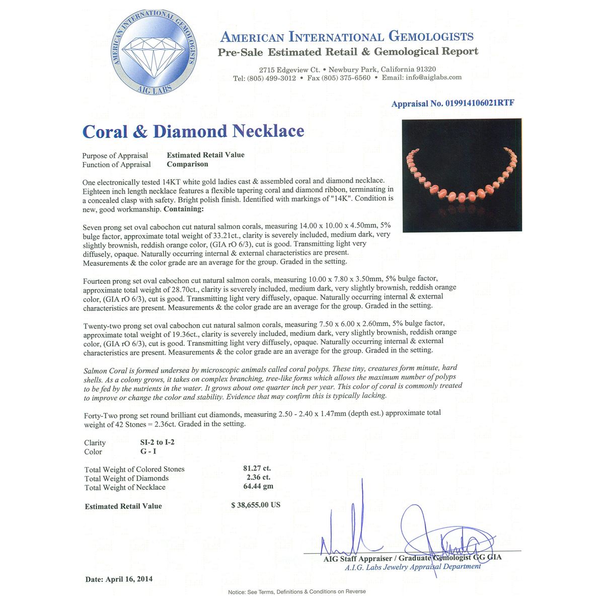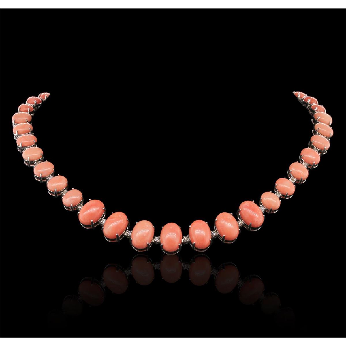 One electronically tested 14KT white gold ladies cast & assembled coral and diamond necklace. Condition is new, good workmanship. Eighteen inch length necklace features a flexible tapering coral and diamond ribbon, terminating in a concealed clasp with safety. Bright polish finish. Identified with markings of ""14K"". Containing: Seven prong set oval cabochon cut natural salmon corals, measuring 14.00 x 10.00 x 4.50mm, 5% bulge factor, approximate total weight of 33.21ct., clarity is severely included, medium dark, very slightly brownish, reddish orange color, (GIA rO 6/3), cut is good. Transmitting light very diffusely, opaque. Naturally occurring internal & external characteristics are present. Measurements & the color grade are an average for the group. Graded in the setting. Fourteen prong set oval cabochon cut natural salmon corals, measuring 10.00 x 7.80 x 3.50mm, 5% bulge factor, approximate total weight of 28.70ct., clarity is severely included, medium dark, very slightly brownish, reddish orange color, (GIA rO 6/3), cut is good. Transmitting light very diffusely, opaque. Naturally occurring internal & external characteristics are present. Measurements & the color grade are an average for the group. Graded in the setting. Twenty-two prong set oval cabochon cut natural salmon corals, measuring 7.50 x 6.00 x 2.60mm, 5% bulge factor, approximate total weight of 19.36ct., clarity is severely included, medium dark, very slightly brownish, reddish orange color, (GIA rO 6/3), cut is good. Transmitting light very diffusely, opaque. Naturally occurring internal & external characteristics are present. Measurements & the color grade are an average for the group. Graded in the setting. Salmon Coral is formed undersea by microscopic animals called coral polyps. These tiny, creatures form minute, hard shells. As a colony grows, it takes on complex branching, tree-like forms which allows the maximum number of polyps to be fed by the nutrients in the water. It grows about one quarter inch per year. This color of coral is commonly treated to improve or change the color and stability. Evidence that may confirm this is typically lacking. Forty-Two prong set round brilliant cut diamonds, measuring 2.50 - 2.40 x 1.47mm (depth est.) approximate total weight of 42 Stones = 2.36ct. Graded in the setting. Clarity SI-2 to I-2 Color G - I Total Weight of Colored Stones 81.27 ct. Total Weight of Diamonds 2.36 ct. Total Weight of Necklace 64.44 grams AIG Appraised at $38,655.00.