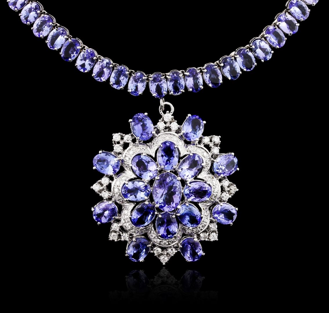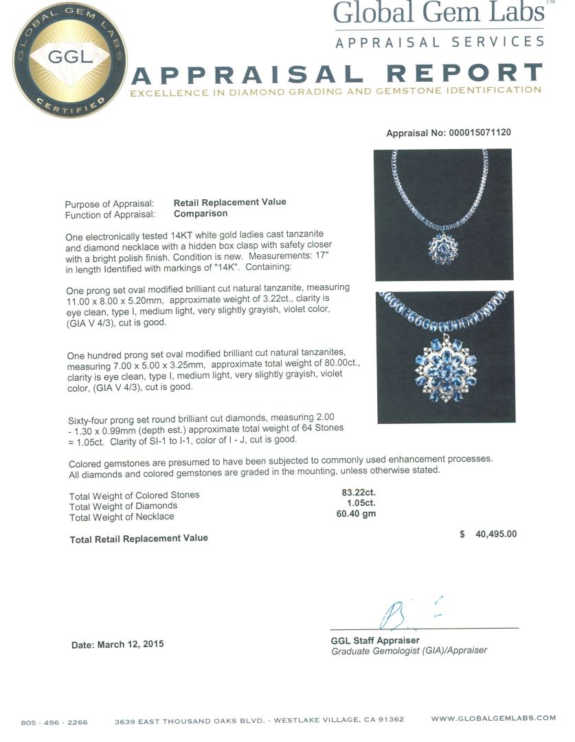 One electronically tested 14KT white gold ladies cast tanzanite and diamond necklace with a hidden box clasp with safety closer with a bright polish finish. Measurements: 17" in length Identified with markings of "14K". Condition is new. Containing: One prong set oval modified brilliant cut natural tanzanite, measuring 11.00. x 8.00. x 5.20mm, approximate weight of 3.22ct., clarity is eye clean, type I, medium light, very slightly grayish, violet color, (GIA V 4/3), cut is good. One hundred prong set oval modified brilliant cut natural tanzanites, measuring 7.00. x 5.00. x 3.25mm, approximate total weight of 80.00.ct., clarity is eye clean, type I, medium light, very slightly grayish, violet color, (GIA V 4/3), cut is good. Sixty-Four prong set round brilliant cut diamonds, measuring 2.00. - 1.30 x 0.99mm (depth est.) approximate total weight of 64 Stones = 1.05ct. Clarity: SI-1 to I-1. Color: I - J, Cut is Good. Colored gemstones are presumed to have been subjected to commonly used enhancement processes. All diamonds and colored gemstones are graded in the mounting, unless otherwise stated. Total Weight of Colored Stones 83.22ct. Total Weight of Diamonds 1.05ct. Total Weight of Necklace 60.40 grams. GGL Appraised at $40,495.00.