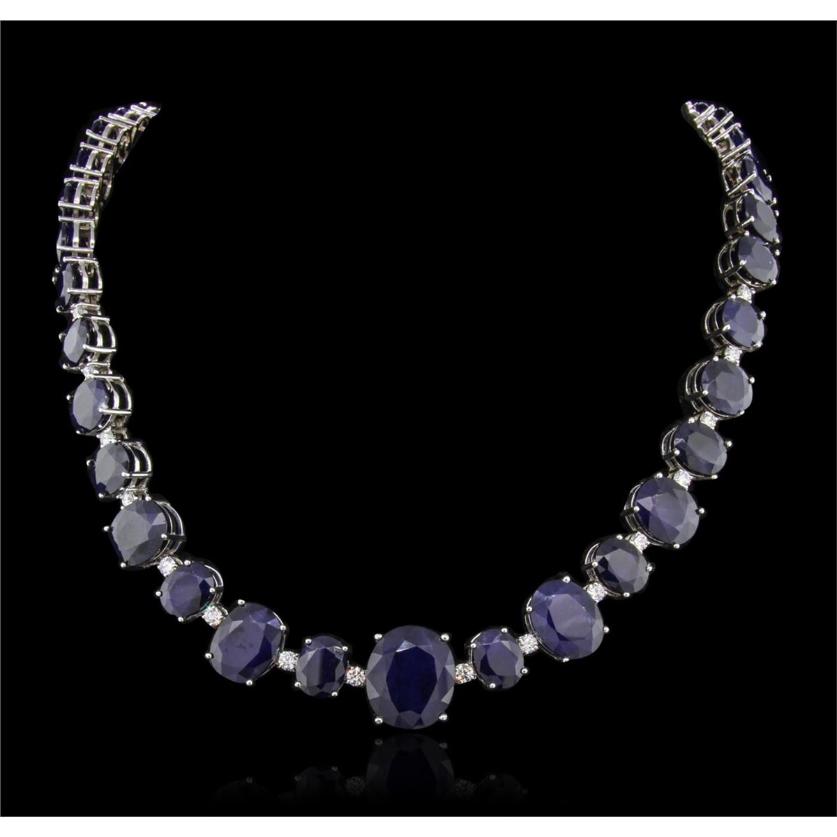 One electronically tested 14KT white gold ladies cast & assembled sapphire and diamond necklace with a bright polish finish. Condition is new, good workmanship. The necklace features a ribbon of sapphires interspersed with diamonds terminating in a concealed clasp with safety. Identified with markings of "14K". Containing: One prong set oval mixed cut natural blue sapphire, measuring 16.70 x 14.35 x 8.00mm, 8% bulge factor, approximate weight of 16.67ct, clarity is severely included, type II, dark, strong, violetish blue color, (GIA vB 7/5), cut is good. Transmitting light diffusely, translucent to opaque. Naturally occurring internal & external characteristics are present. Indications of multiple laboratory enhancements, including high temperature heat treatment. Graded in the setting. Thirty-eight prong set oval mixed cut natural blue sapphires, measuring 10.00 x 8.00 x 5.20mm, 8% bulge factor, approximate. Total Weight of 138.32ct, clarity is severely included, type II, dark, strong, violetish blue color, (GIA vB 7/5), cut is good. Transmitting light diffusely, translucent to opaque. Naturally occurring internal & external characteristics are present. Indications of multiple laboratory enhancements, including high temperature heat treatment. Measurements & the color grade are an average for the group. Graded in the setting. Four prong set oval mixed cut natural blue sapphires, measuring 16.00 x 10.50 x 6.83mm, 8% bulge factor, approximate. Total Weight of 41.44ct, clarity is severely included, type II, dark, strong, violetish blue color, (GIA vB 7/5), cut is good. Transmitting light diffusely, translucent to opaque. Naturally occurring internal & external characteristics are present. Indications of multiple laboratory enhancements, including high temperature heat treatment. Measurements & the color grade are an average for the group. Graded in the setting. Sixteen prong set round brilliant cut diamonds, measuring 3.00 - 3.00 x 1.80mm (depth est.) approximate. Total Weight of 16 Stones = 1.68ct. Graded in the setting. Clarity: SI-2 to I-1. Color: G - I. Total Weight of Colored Stones196.43ct. Total Weight of Diamonds 1.68ct. Total Weight of Necklace 69.80 grams. AIG Appraised at $36,440.00.