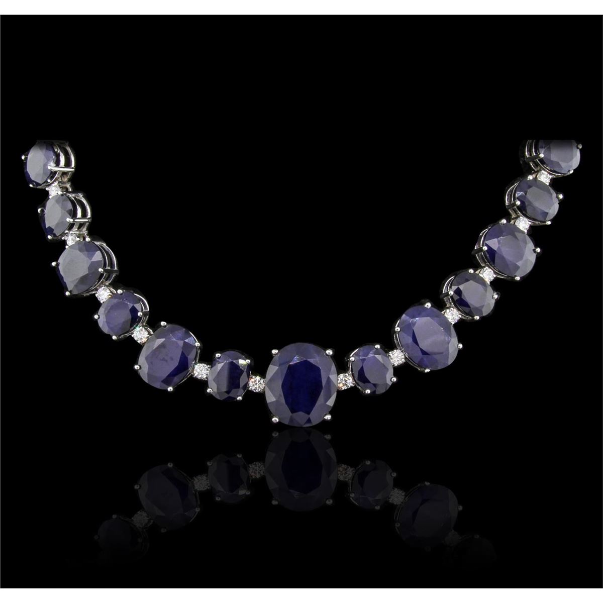 One electronically tested 14KT white gold ladies cast & assembled sapphire and diamond necklace with a bright polish finish. Condition is new, good workmanship. The necklace features a ribbon of sapphires interspersed with diamonds terminating in a concealed clasp with safety. Identified with markings of "14K". Containing: One prong set oval mixed cut natural blue sapphire, measuring 16.70 x 14.35 x 8.00mm, 8% bulge factor, approximate weight of 16.67ct, clarity is severely included, type II, dark, strong, violetish blue color, (GIA vB 7/5), cut is good. Transmitting light diffusely, translucent to opaque. Naturally occurring internal & external characteristics are present. Indications of multiple laboratory enhancements, including high temperature heat treatment. Graded in the setting. Thirty-eight prong set oval mixed cut natural blue sapphires, measuring 10.00 x 8.00 x 5.20mm, 8% bulge factor, approximate. Total Weight of 138.32ct, clarity is severely included, type II, dark, strong, violetish blue color, (GIA vB 7/5), cut is good. Transmitting light diffusely, translucent to opaque. Naturally occurring internal & external characteristics are present. Indications of multiple laboratory enhancements, including high temperature heat treatment. Measurements & the color grade are an average for the group. Graded in the setting. Four prong set oval mixed cut natural blue sapphires, measuring 16.00 x 10.50 x 6.83mm, 8% bulge factor, approximate. Total Weight of 41.44ct, clarity is severely included, type II, dark, strong, violetish blue color, (GIA vB 7/5), cut is good. Transmitting light diffusely, translucent to opaque. Naturally occurring internal & external characteristics are present. Indications of multiple laboratory enhancements, including high temperature heat treatment. Measurements & the color grade are an average for the group. Graded in the setting. Sixteen prong set round brilliant cut diamonds, measuring 3.00 - 3.00 x 1.80mm (depth est.) approximate. Total Weight of 16 Stones = 1.68ct. Graded in the setting. Clarity: SI-2 to I-1. Color: G - I. Total Weight of Colored Stones196.43ct. Total Weight of Diamonds 1.68ct. Total Weight of Necklace 69.80 grams. AIG Appraised at $36,440.00.