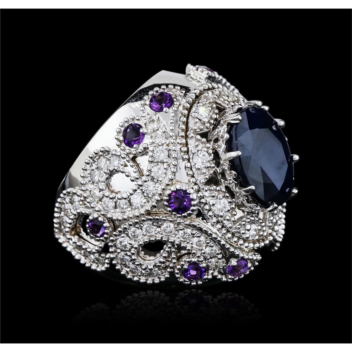 One electronically tested 14KT white gold ladies combination cast & assembled sapphire, amethyst and diamond ring with a bright polish finish. Condition is new. Containing: One prong set oval modified brilliant cut natural blue sapphire, measuring 12.85 x 10.75 x 6.99mm, approximate weight of 8.11ct., clarity is heavily included, type II, dark, moderately strong, blue color, (GIA B 7/4), cut is good. Ten prong set round modified brilliant cut natural amethysts, measuring 3.00 - 3.00 x 1.95 mm, approximate total weight of 0.90ct., clarity is eye clean, type II, medium, moderately strong, purple color, (GIA P 5/4), cut is good. Seventy prong set round brilliant cut diamonds, measuring 1.80 - 1.80 x 1.08mm (depth est.) approximate total weight of 70 Stones = 1.49ct. Clarity: SI-2 to I-1. Color: I - J, Cut is Good. Colored gemstones are presumed to have been subjected to commonly used enhancement processes. All diamonds and colored gemstones are graded in the mounting, unless otherwise stated. Total Weight of Colored Stones 9.01ct. Total Weight of Diamonds 1.49ct. Total Weight of Ring 20.30 grams. GGL Appraised at $6,620.00.