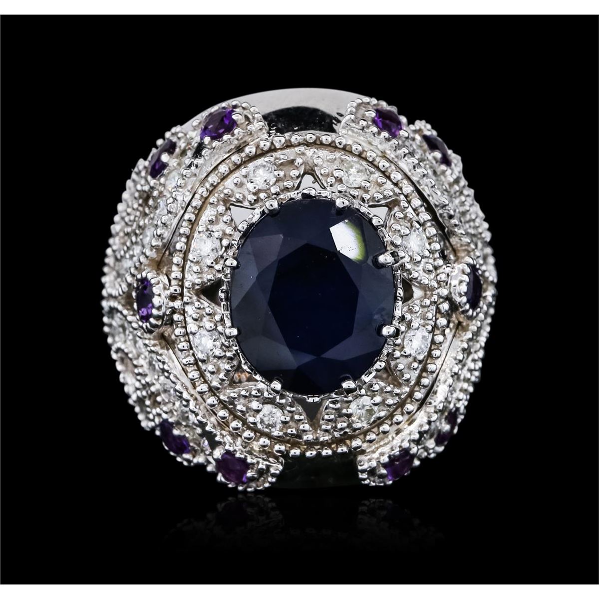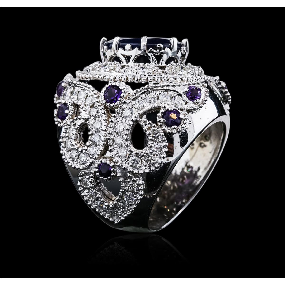 One electronically tested 14KT white gold ladies combination cast & assembled sapphire, amethyst and diamond ring with a bright polish finish. Condition is new. Containing: One prong set oval modified brilliant cut natural blue sapphire, measuring 12.85 x 10.75 x 6.99mm, approximate weight of 8.11ct., clarity is heavily included, type II, dark, moderately strong, blue color, (GIA B 7/4), cut is good. Ten prong set round modified brilliant cut natural amethysts, measuring 3.00 - 3.00 x 1.95 mm, approximate total weight of 0.90ct., clarity is eye clean, type II, medium, moderately strong, purple color, (GIA P 5/4), cut is good. Seventy prong set round brilliant cut diamonds, measuring 1.80 - 1.80 x 1.08mm (depth est.) approximate total weight of 70 Stones = 1.49ct. Clarity: SI-2 to I-1. Color: I - J, Cut is Good. Colored gemstones are presumed to have been subjected to commonly used enhancement processes. All diamonds and colored gemstones are graded in the mounting, unless otherwise stated. Total Weight of Colored Stones 9.01ct. Total Weight of Diamonds 1.49ct. Total Weight of Ring 20.30 grams. GGL Appraised at $6,620.00.