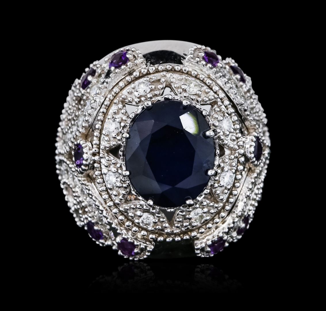 One electronically tested 14KT white gold ladies combination cast & assembled sapphire, amethyst and diamond ring with a bright polish finish. Condition is new. Containing: One prong set oval modified brilliant cut natural blue sapphire, measuring 12.85 x 10.75 x 6.99mm, approximate weight of 8.11ct., clarity is heavily included, type II, dark, moderately strong, blue color, (GIA B 7/4), cut is good. Ten prong set round modified brilliant cut natural amethysts, measuring 3.00 - 3.00 x 1.95 mm, approximate total weight of 0.90ct., clarity is eye clean, type II, medium, moderately strong, purple color, (GIA P 5/4), cut is good. Seventy prong set round brilliant cut diamonds, measuring 1.80 - 1.80 x 1.08mm (depth est.) approximate total weight of 70 Stones = 1.49ct. Clarity: SI-2 to I-1. Color: I - J, Cut is Good. Colored gemstones are presumed to have been subjected to commonly used enhancement processes. All diamonds and colored gemstones are graded in the mounting, unless otherwise stated. Total Weight of Colored Stones 9.01ct. Total Weight of Diamonds 1.49ct. Total Weight of Ring 20.30 grams. GGL Appraised at $6,620.00.