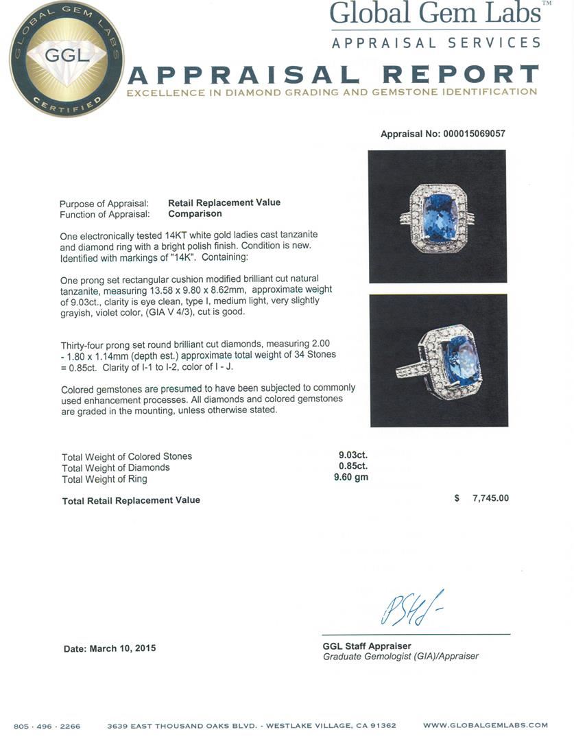One electronically tested 14KT white gold ladies cast tanzanite and diamond ring with a bright polish finish. Identified with markings of "14K". Condition is new. Containing: One prong set rectangular cushion modified brilliant cut natural tanzanite, measuring 13.58 x 9.80 x 8.62mm, approximate weight of 9.03ct., clarity is eye clean, type I, medium light, very slightly grayish, violet color, (GIA V 4/3), cut is good. Thirty-Four prong set round brilliant cut diamonds, measuring 2.00 - 1.80 x 1.14mm (depth est.) approximate total weight of 34 Stones = 0.85ct. Clarity: I-1 to I-2. Color: I - J. Colored gemstones are presumed to have been subjected to commonly used enhancement processes. All diamonds and colored gemstones are graded in the mounting, unless otherwise stated. Total Weight of Colored Stones 9.03ct. Total Weight of Diamonds 0.85ct. Total Weight of Ring 9.60 grams. GGL Appraised at $7,745.00.