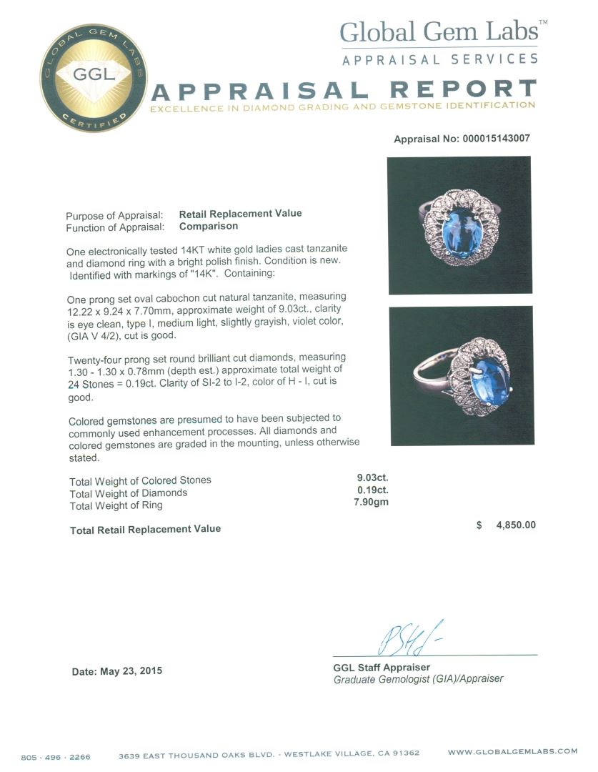 One electronically tested 14KT white gold ladies cast tanzanite and diamond ring with a bright polish finish. Identified with markings of "14K". Condition is new. Containing: One prong set oval cabochon cut natural tanzanite, measuring 12.22 x 9.24 x 7.70mm, approximate weight of 9.03ct., clarity is eye clean, type I, medium light, slightly grayish, violet color, (GIA V 4/2), cut is good. Twenty-Four prong set round brilliant cut diamonds, measuring 1.30 - 1.30 x 0.78mm (depth est.) approximate total weight of 24 Stones = 0.19ct. Clarity: SI-2 to I-2. Color: H - I, Cut is Good. Colored gemstones are presumed to have been subjected to commonly used enhancement processes. All diamonds and colored gemstones are graded in the mounting, unless otherwise stated. Total Weight of Colored Stones 9.03ct. Total Weight of Diamonds 0.19ct. Total Weight of Ring 7.90 grams. GGL Appraised at $4,850.00.