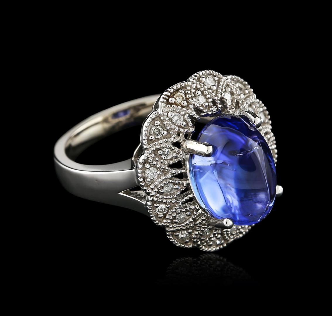 One electronically tested 14KT white gold ladies cast tanzanite and diamond ring with a bright polish finish. Identified with markings of "14K". Condition is new. Containing: One prong set oval cabochon cut natural tanzanite, measuring 12.22 x 9.24 x 7.70mm, approximate weight of 9.03ct., clarity is eye clean, type I, medium light, slightly grayish, violet color, (GIA V 4/2), cut is good. Twenty-Four prong set round brilliant cut diamonds, measuring 1.30 - 1.30 x 0.78mm (depth est.) approximate total weight of 24 Stones = 0.19ct. Clarity: SI-2 to I-2. Color: H - I, Cut is Good. Colored gemstones are presumed to have been subjected to commonly used enhancement processes. All diamonds and colored gemstones are graded in the mounting, unless otherwise stated. Total Weight of Colored Stones 9.03ct. Total Weight of Diamonds 0.19ct. Total Weight of Ring 7.90 grams. GGL Appraised at $4,850.00.