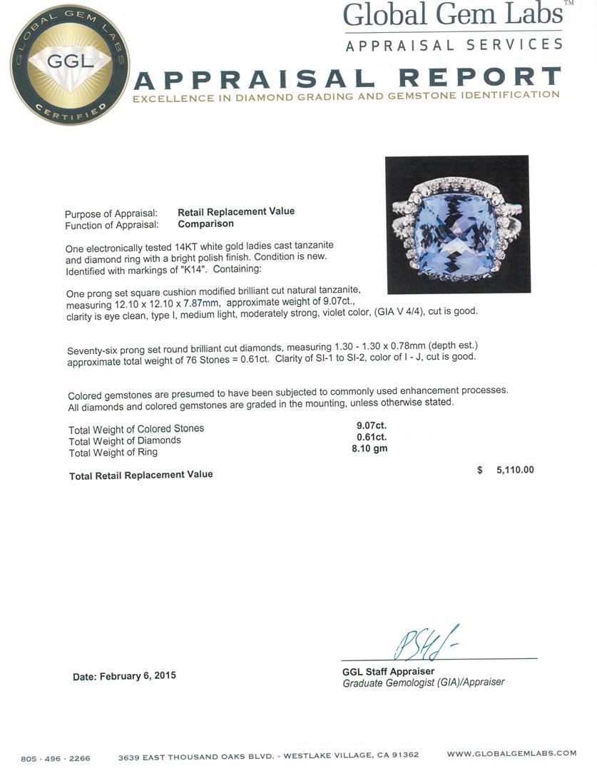 One electronically tested 14KT white gold ladies cast tanzanite and diamond ring with a bright polish finish. Identified with markings of "K14". Condition is new. Containing: One prong set square cushion modified brilliant cut natural tanzanite, measuring 12.10 x 12.10 x 7.87mm, approximate weight of 9.07ct., clarity is eye clean, type I, medium light, moderately strong, violet color, (GIA V 4/4), cut is good. Seventy-Six prong set round brilliant cut diamonds, measuring 1.30 - 1.30 x 0.78mm (depth est.) approximate. Total Weight of 76 Stones = 0.61ct. Clarity: SI-1 to SI-2. Color: I - J, Cut is Good. Colored gemstones are presumed to have been subjected to commonly used enhancement processes. All diamonds and colored gemstones are graded in the mounting, unless otherwise stated. Total Weight of Colored Stones 9.07ct. Total Weight of Diamonds 0.61ct. Total Weight of Ring 8.10 grams. GGL Appraised.