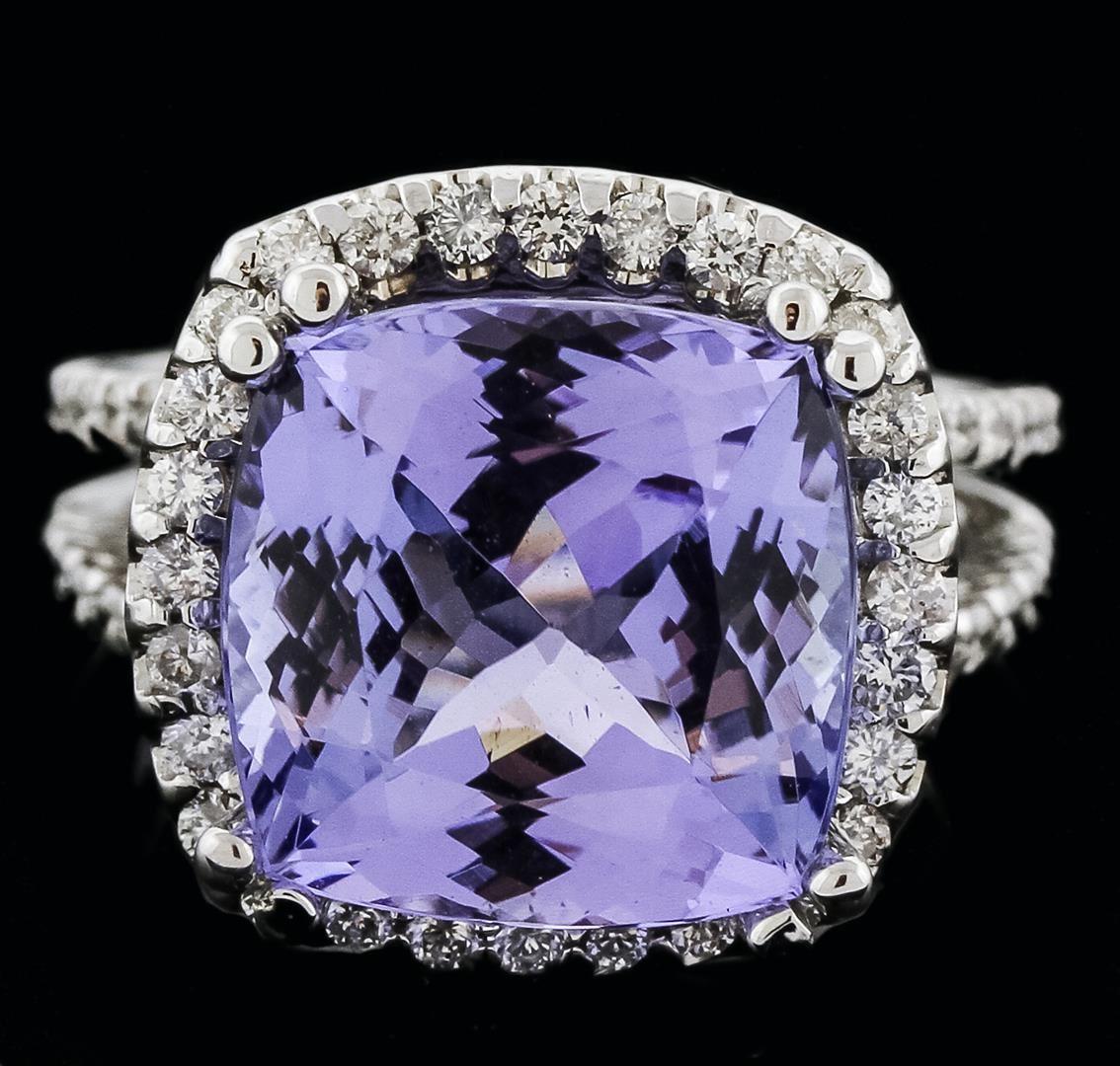 One electronically tested 14KT white gold ladies cast tanzanite and diamond ring with a bright polish finish. Identified with markings of "K14". Condition is new. Containing: One prong set square cushion modified brilliant cut natural tanzanite, measuring 12.10 x 12.10 x 7.87mm, approximate weight of 9.07ct., clarity is eye clean, type I, medium light, moderately strong, violet color, (GIA V 4/4), cut is good. Seventy-Six prong set round brilliant cut diamonds, measuring 1.30 - 1.30 x 0.78mm (depth est.) approximate. Total Weight of 76 Stones = 0.61ct. Clarity: SI-1 to SI-2. Color: I - J, Cut is Good. Colored gemstones are presumed to have been subjected to commonly used enhancement processes. All diamonds and colored gemstones are graded in the mounting, unless otherwise stated. Total Weight of Colored Stones 9.07ct. Total Weight of Diamonds 0.61ct. Total Weight of Ring 8.10 grams. GGL Appraised at $5,110.00.