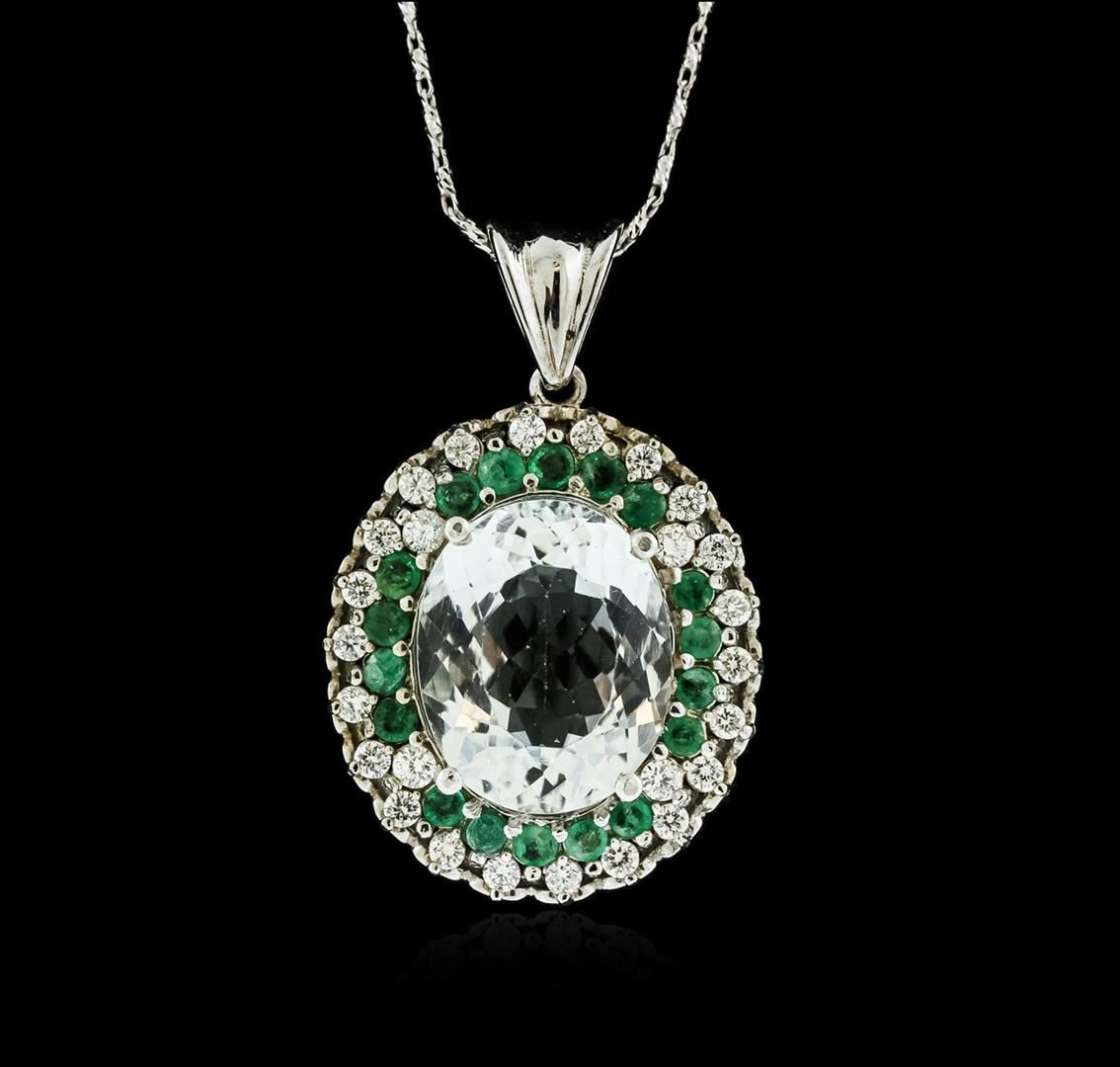 One electronically tested 14KT white gold ladies cast aquamarine, emerald and diamond pendant & chain 18.0" long, with a lobster claw clasp with a bright polish finish. Identified with markings of "14K". Condition is new. Containing: One prong set oval modified brilliant cut natural aquamarine, measuring 16.39 x 12.77 x 7.60mm, approximate weight of 9.09ct., clarity is eye clean, type I, very light, grayish, blue color, (GIA B 2/1), cut is good. Eighteen prong set round modified brilliant cut natural emeralds, measuring 2.30 - 2.30 x 1.50 mm, approximate total weight of 0.72ct., clarity is heavily included, type III, medium light, very slightly grayish, very slightly bluish green color, (GIA vslbG 4/3), cut is good. Twenty-Six prong set round brilliant cut diamonds, measuring 2.10 - 1.80 x 1.17mm (depth est.) approximate total weight of 26 Stones = 0.40ct. Clarity: SI-1 to I-1. Color: I - J, Cut is Good. Colored gemstones are presumed to have been subjected to commonly used enhancement processes. All diamonds and colored gemstones are graded in the mounting, unless otherwise stated. Total Weight of Colored Stones 9.81ct. Total Weight of Diamonds 0.40ct. Total Weight of Pendant & Chain 11.10 grams. GGL Appraised at $4,630.00.