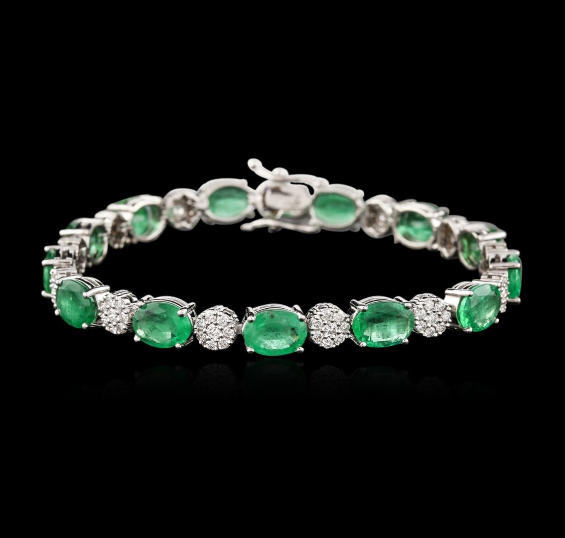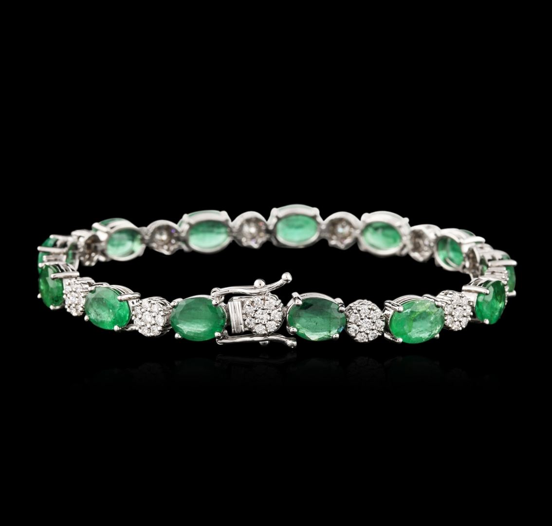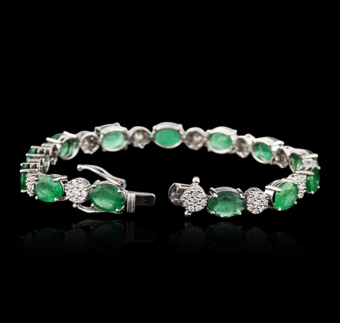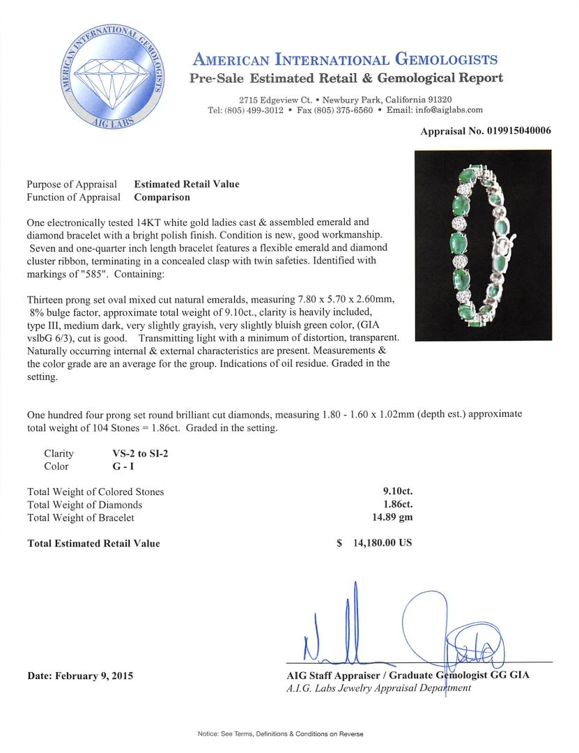 One electronically tested 14KT white gold ladies cast & assembled emerald and diamond bracelet with a bright polish finish. Seven and one-quarter inch length bracelet features a flexible emerald and diamond cluster ribbon, terminating in a concealed clasp with twin safeties. Identified with markings of "585". Condition is new, good workmanship. Containing: Thirteen prong set oval mixed cut natural emeralds, measuring 7.80 x 5.70 x 2.60mm, 8% bulge factor, approximate total weight of 9.10ct., clarity is heavily included, type III, medium dark, very slightly grayish, very slightly bluish green color, (GIA vslbG 6/3), cut is good. Transmitting light with a minimum of distortion, transparent. Naturally occurring internal & external characteristics are present. Measurements &the color grade are an average for the group. Indications of oil residue. Graded in the setting. One Hundred Four prong set round brilliant cut diamonds, measuring 1.80 - 1.60 x 1.02mm (depth est.) approximate total weight of 104 Stones = 1.86ct. Graded in the setting. Clarity: VS-2 to SI-2. Color: G - I. Total Weight of Colored Stones 9.10ct. Total Weight of Diamonds 1.86ct. Total Weight of Bracelet 14.89 grams. AIG Appraised at $14,180.00.