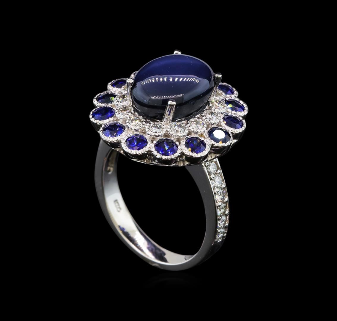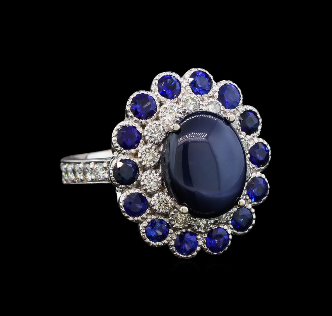 One electronically tested 14KT white gold ladies cast sapphire and diamond ring with a bright polish finish. Identified with markings of "14K". Condition is new. Containing: One prong set oval cabochon cut natural blue star sapphire, measuring 12.00. x 8.50 x 6.50mm, approximate weight of 7.16ct., clarity is moderately included, medium, moderately strong, blue color, (GIA B 5/4), cut is good. This stone has a incomplete six ray star with medium intensity and fair movement. Fourteen gypsy set round modified brilliant cut natural blue sapphires, measuring 3.00. - 3.00. x 1.95 mm, approximate total weight of 1.96ct., clarity is heavily included, type II, medium, moderately strong, blue color, (GIA B 5/4), cut is good. Twenty-Six prong set round brilliant cut diamonds, measuring 1.80 - 1.80 x 1.08mm (depth est.) approximate total weight of 26 Stones = 0.55ct. Clarity: SI-1 to I-1. Color: I - J, Cut is Good. Colored gemstones are presumed to have been subjected to commonly used enhancement processes. All diamonds and colored gemstones are graded in the mounting, unless otherwise stated. Total Weight of Colored Stones 9.12ct. Total Weight of Diamonds 0.55ct. Total Weight of Ring 9.60 grams. GGL Appraised at $4,790.00.
