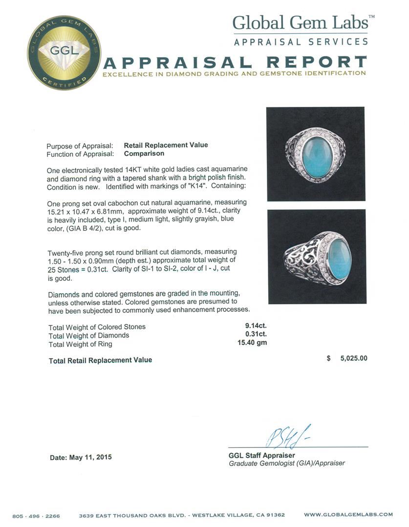 One electronically tested 14KT white gold ladies cast aquamarine and diamond ring with a tapered shank with a bright polish finish. Identified with markings of "K14". Condition is new. Containing: One prong set oval cabochon cut natural aquamarine, measuring 15.21 x 10.47 x 6.81mm, approximate weight of 9.14ct., clarity is heavily included, type I, medium light, slightly grayish, blue color, (GIA B 4/2), cut is good. Twenty-Five prong set round brilliant cut diamonds, measuring 1.50 - 1.50 x 0.90mm (depth est.) approximate total weight of 25 Stones = 0.31ct. Clarity: SI-1 to SI-2. Color: I - J, Cut is Good. Diamonds and colored gemstones are graded in the mounting, unless otherwise stated. Colored gemstones are presumed to have been subjected to commonly used enhancement processes. Total Weight of Colored Stones 9.14ct. Total Weight of Diamonds 0.31ct. Total Weight of Ring 15.40 grams. GGL Appraised at $5,025.00.