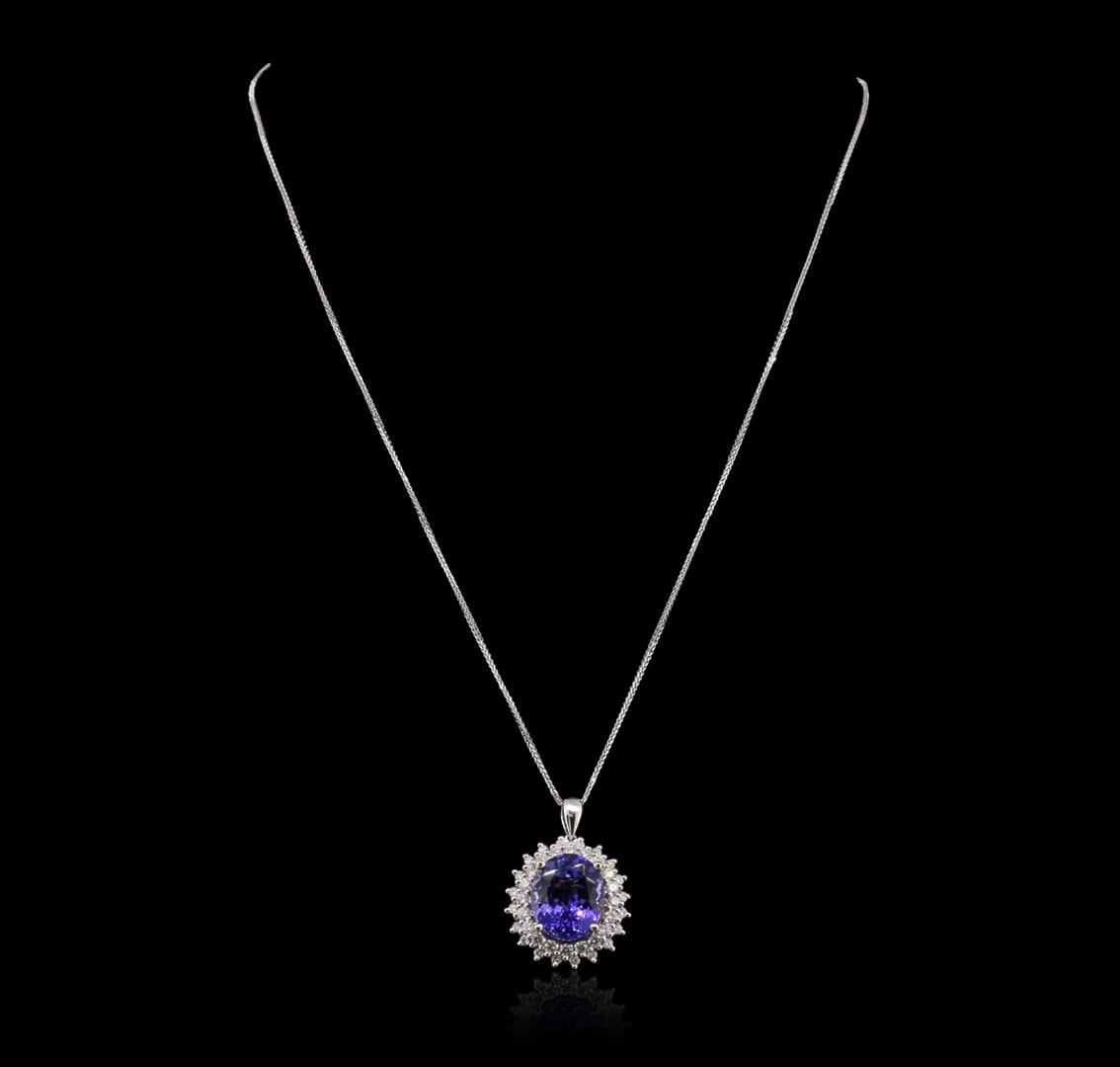 One electronically tested 14KT white gold ladies cast & assembled tanzanite and diamond pendant with chain. Condition is new, good workmanship. The pendant features a tanzanite set within a tiered diamond bezel, completed by a white gold bail. The pendant is supported by an eighteen inch length 14KT white gold designer style chain, terminating in a lobster claw clasp. Bright polish finish. Identified with markings of "14K". Containing: One prong set oval brilliant cut natural tanzanite, measuring 13.80 x 11.50 x 7.89mm, 8% bulge factor, approximate weight of 9.14ct., clarity is eye clean, type I, dark, very slightly grayish, violetish blue color, (GIA vB 7/3), cut is good. Transmitting light with no distortion, transparent. Colored Stone Grading Report attached. Graded in the setting. Tanzanite is a very rare gemstone that is only found in the country of Tanzania. Originally discovered in 1967. Tiffany & Company, named the stone Tanzanite. It is found in the Usumburu Mountains that border the Umba Valley of northern Tanzania. Tanzanite occurs in gray, brown, violet, blue, reddish-purple, & green. The gem is interesting because of its exceptional pleochroism. Rotated in different directions a tanzanite will exhibit multiple changes of color. Tanzanite has a low tolerance to ultrasonic cleaning, and should not be cleaned using this method. Twenty prong set round brilliant cut diamonds, measuring 2.10 - 2.00 x 1.23mm (depth est.) approximate total weight of 20 Stones = 0.73ct. Graded in the setting. Clarity SI-1 to I-1 Color H - J Twenty prong set round brilliant cut diamonds, measuring 1.60 - 1.50 x 0.93mm (depth est.) approximate total weight of 20 Stones = 0.37ct. Graded in the setting. Clarity SI-1 to I-1 Color H - J Total Weight of Colored Stones 9.14ct. Total Weight of Diamonds 1.10ct. Total Weight of Pendant With Chain 8.30 grams. AIG appraised at $27,225.00. AIG Appraised at $27,225.00.