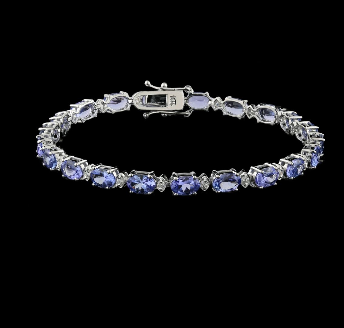 One electronically tested 14KT white gold ladies cast tanzanite and diamond bracelet with a hidden box clasp with safety closer with a bright polish finish. Measurements: 7" in length Identified with markings of "14K". Condition is new. Containing: Twenty-one prong set oval modified brilliant cut natural tanzanites, measuring 6.00 x 4.00 x 2.60mm, approximate total weight of 9.14ct., clarity is eye clean, type I, medium light, very slightly grayish, violet color, (GIA V 4/3), cut is good. Twenty-One prong set round brilliant cut diamonds, measuring 1.50 - 1.50 x 0.90mm (depth est.) approximate total weight of 21 Stones = 0.39ct. Clarity: SI-1 to SI-2. Color: H - I, Cut is Good. Colored gemstones are presumed to have been subjected to commonly used enhancement processes. All diamonds and colored gemstones are graded in the mounting, unless otherwise stated. Total Weight of Colored Stones 9.14ct. Total Weight of Diamonds 0.39ct. Total Weight of Bracelet 9.50 grams. GGL Appraised at $4,975.00.