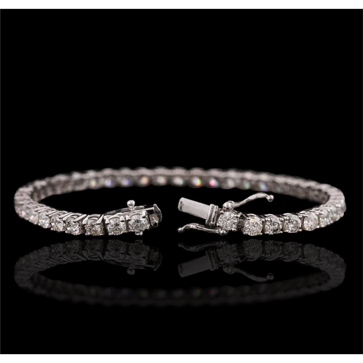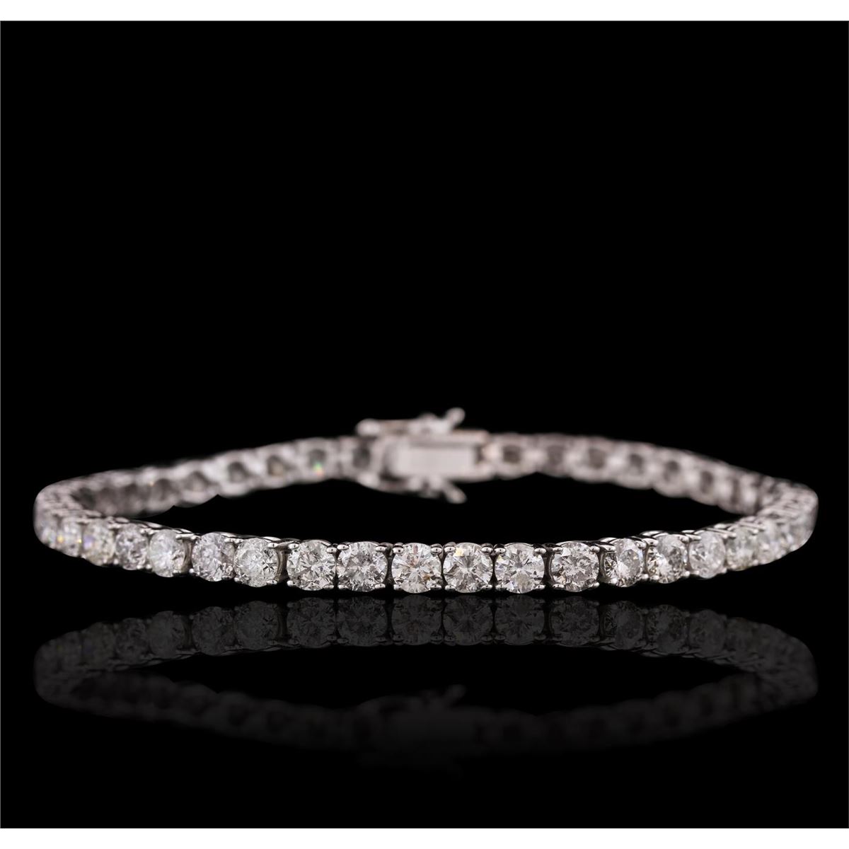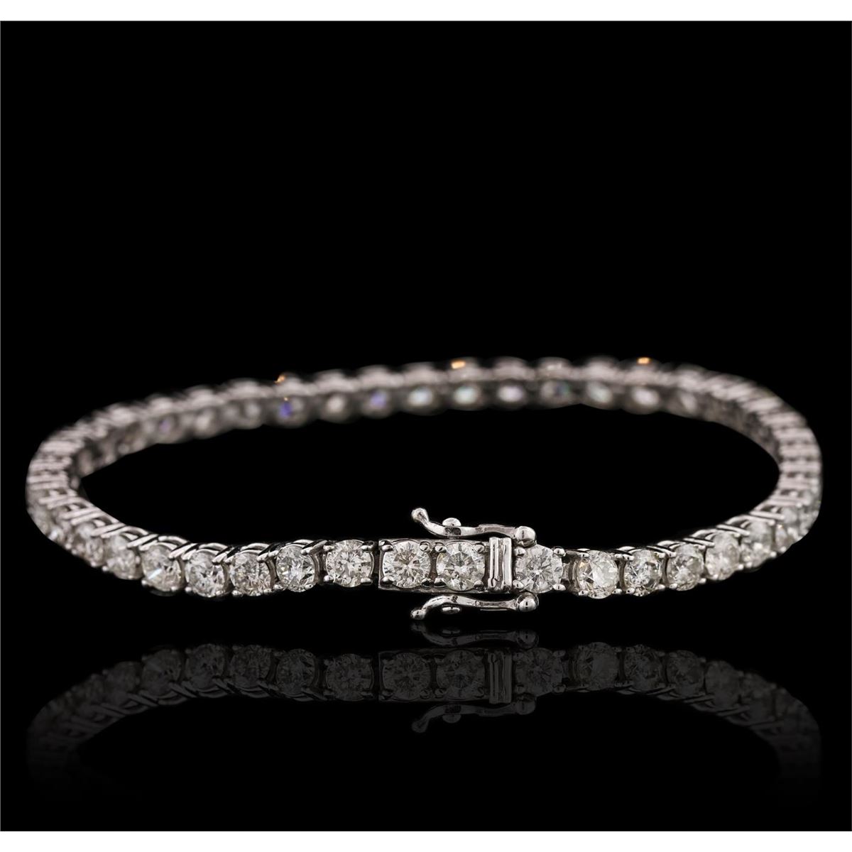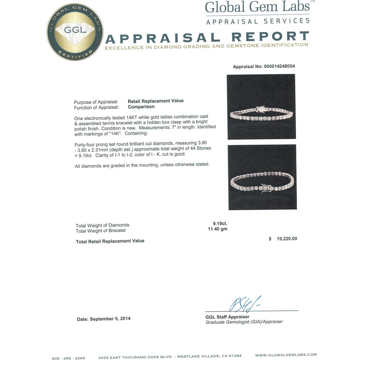 One electronically tested 14KT white gold ladies combination cast & assembled tennis bracelet with a hidden box clasp with a bright polish finish. Measurements: 7" in length. Identified with markings of "14K". Condition is new. Containing: Forty-Four prong set round brilliant cut diamonds, measuring 3.90 - 3.80 x 2.31mm (depth est.) approximate total weight of 44 Stones = 9.19ct. Clarity: I-1 to I-2. Color: I - K, Cut is Good. All diamonds are graded in the mounting, unless otherwise stated. Total Weight of Diamonds 9.19ct. Total Weight of Bracelet 11.40 grams. GGL Appraised at $19,220.00.