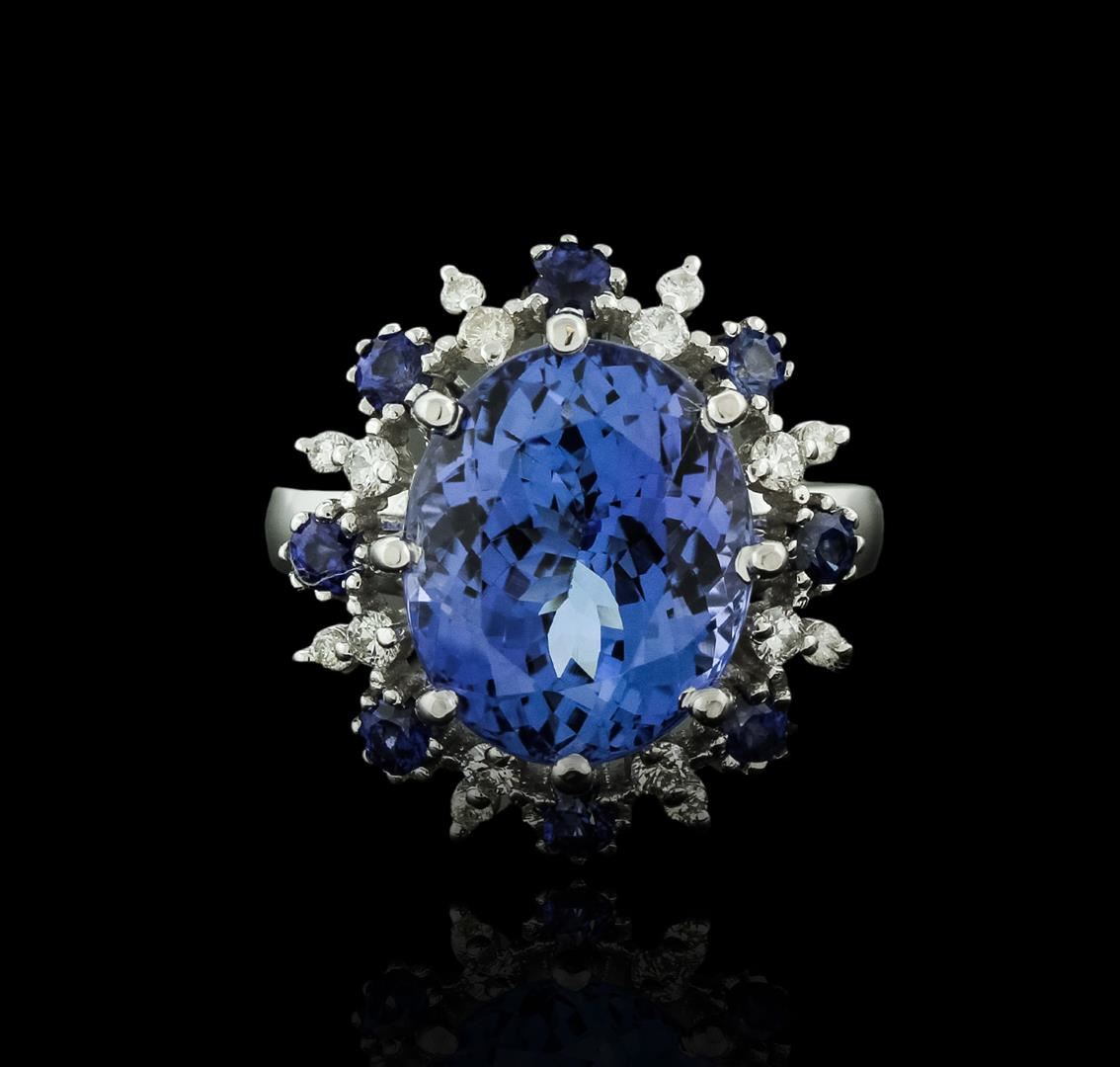 One electronically tested 14KT white gold ladies cast tanzanite, sapphire and diamond ring with a bright polish finish. Identified with markings of "K14". Condition is new. Containing: One prong set oval modified brilliant cut natural tanzanite, measuring 14.00 x 12.00 x 7.80mm, approximate weight of 9.22ct., clarity is eye clean, type I, light, very slightly grayish, violet color, (GIA V 3/3), cut is good. Eight prong set round modified brilliant cut natural blue sapphires, measuring 2.50 - 2.50 x 1.63 mm, approximate total weight of 0.64ct., clarity is eye clean, type II, medium, moderately strong, blue color, (GIA B 5/4), cut is good. Sixteen prong set round brilliant cut diamonds, measuring 1.80 - 1.50 x 0.99mm (depth est.) approximate total weight of 16 Stones = 0.26ct. Clarity: SI-2 to I-1. Color: H - I, Cut is Good. Colored gemstones are presumed to have been subjected to commonly used enhancement processes. All diamonds and colored gemstones are graded in the mounting, unless otherwise stated. Total Weight of Colored Stones 9.86ct. Total Weight of Diamonds 0.26ct. Total Weight of Ring 10.90 grams. GGL Appraised at $7,330.00.