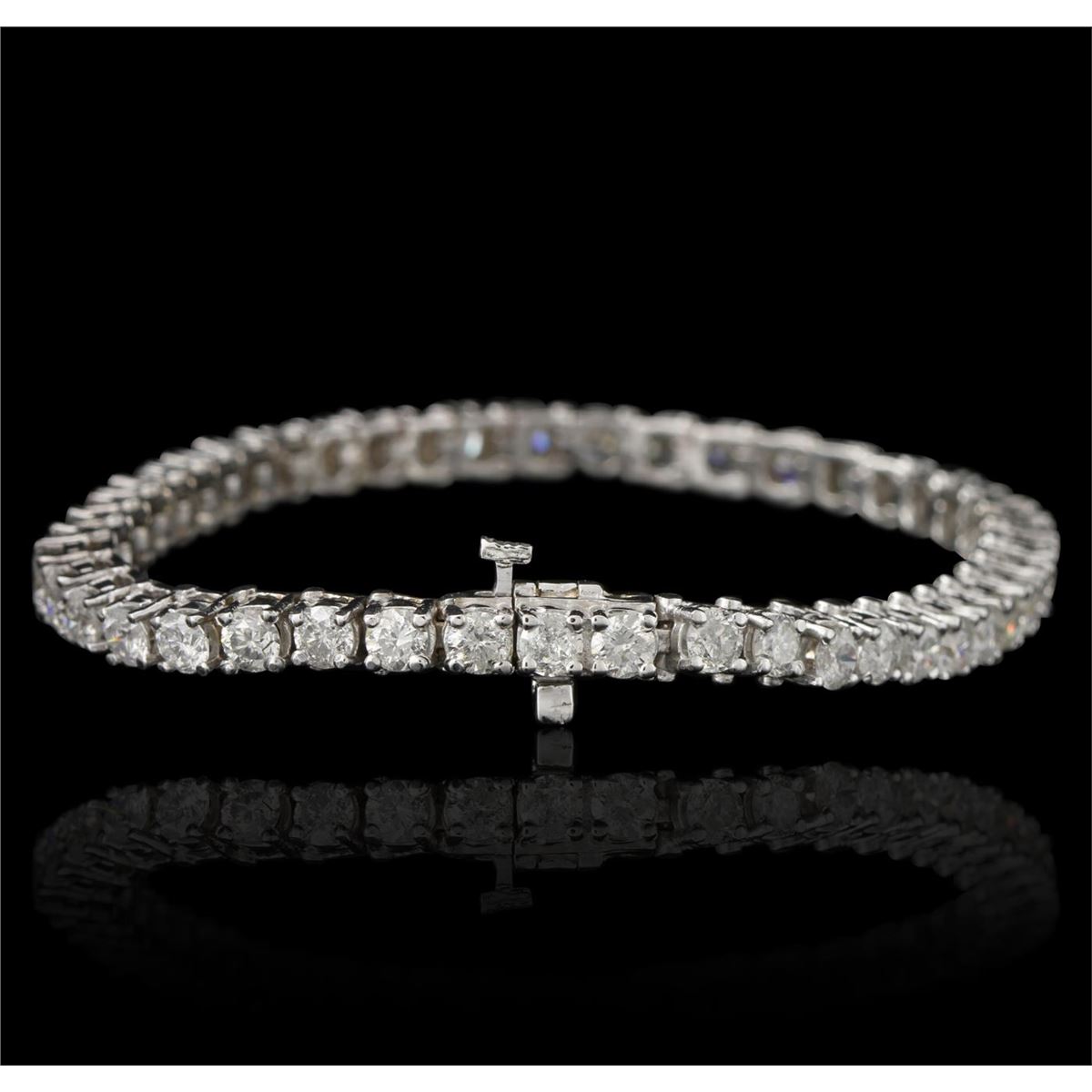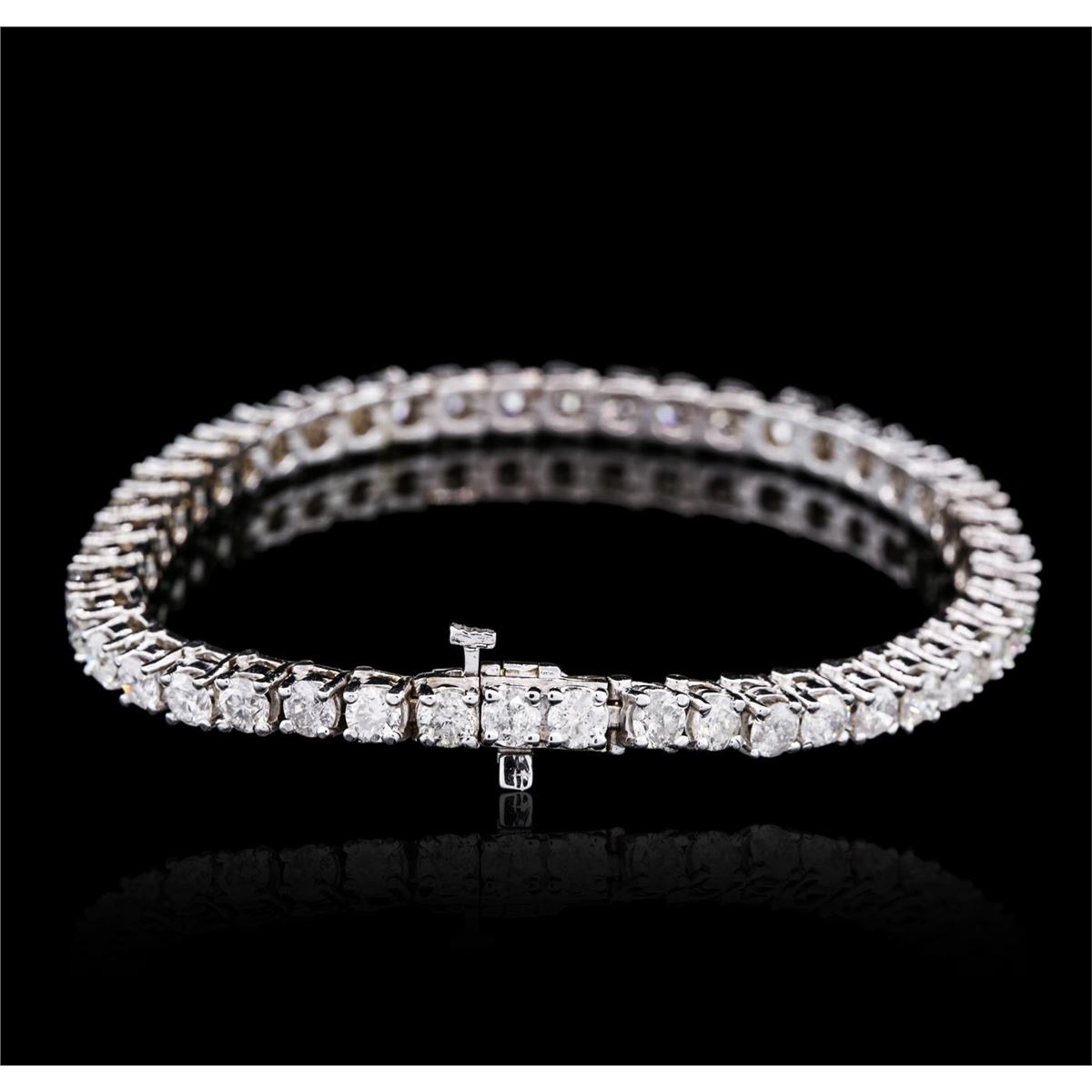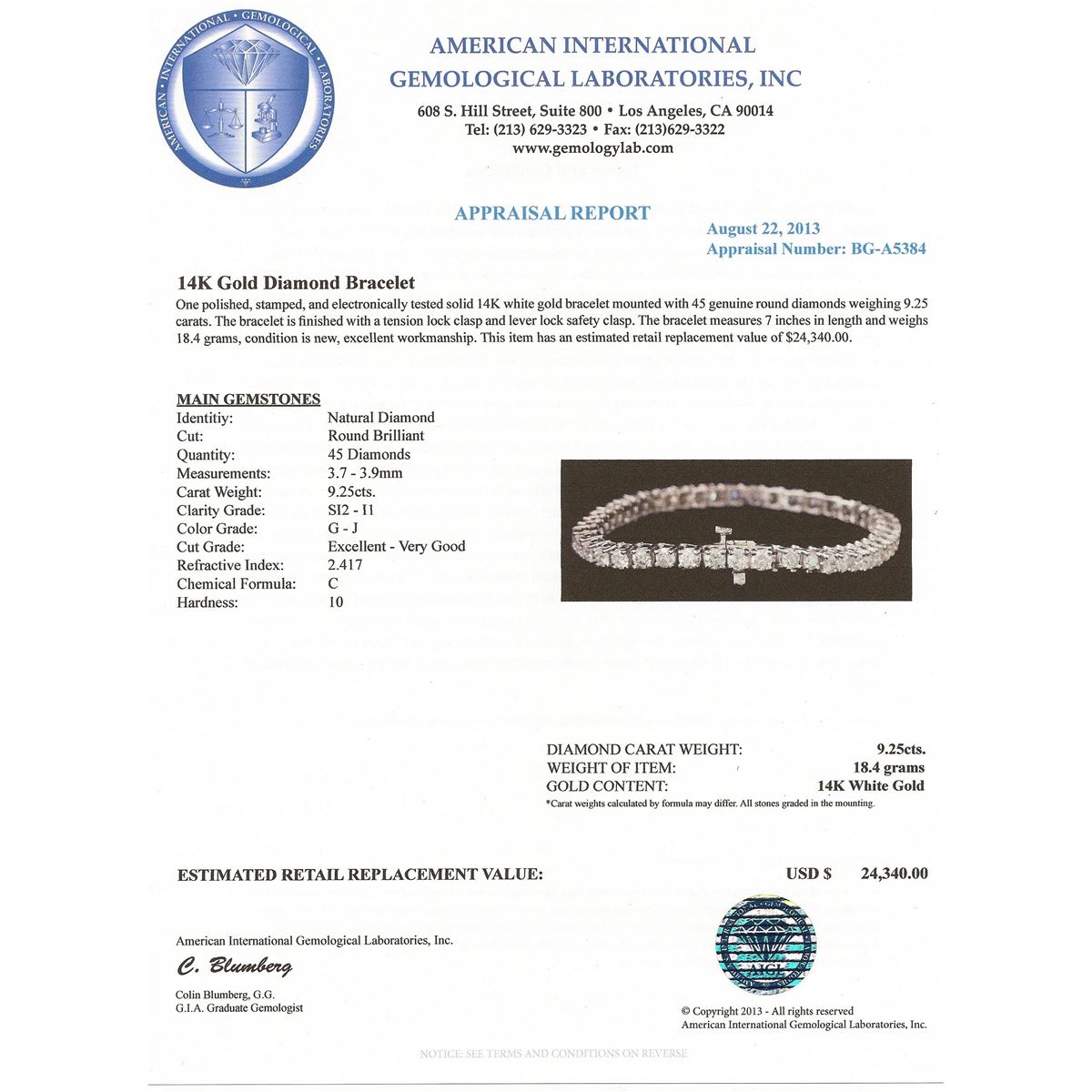 One polished, stamped, and electronically tested solid 14KT White Gold bracelet mounted with 45 genuine round diamonds weighing 9.25 carats. The bracelet is finished with a tension lock clasp and lever lock safety clasp. The bracelet measures 7 inches in length and weighs 18.4 grams, condition is new, excellent workmanship. AIGL Appraised at $24,340.00.