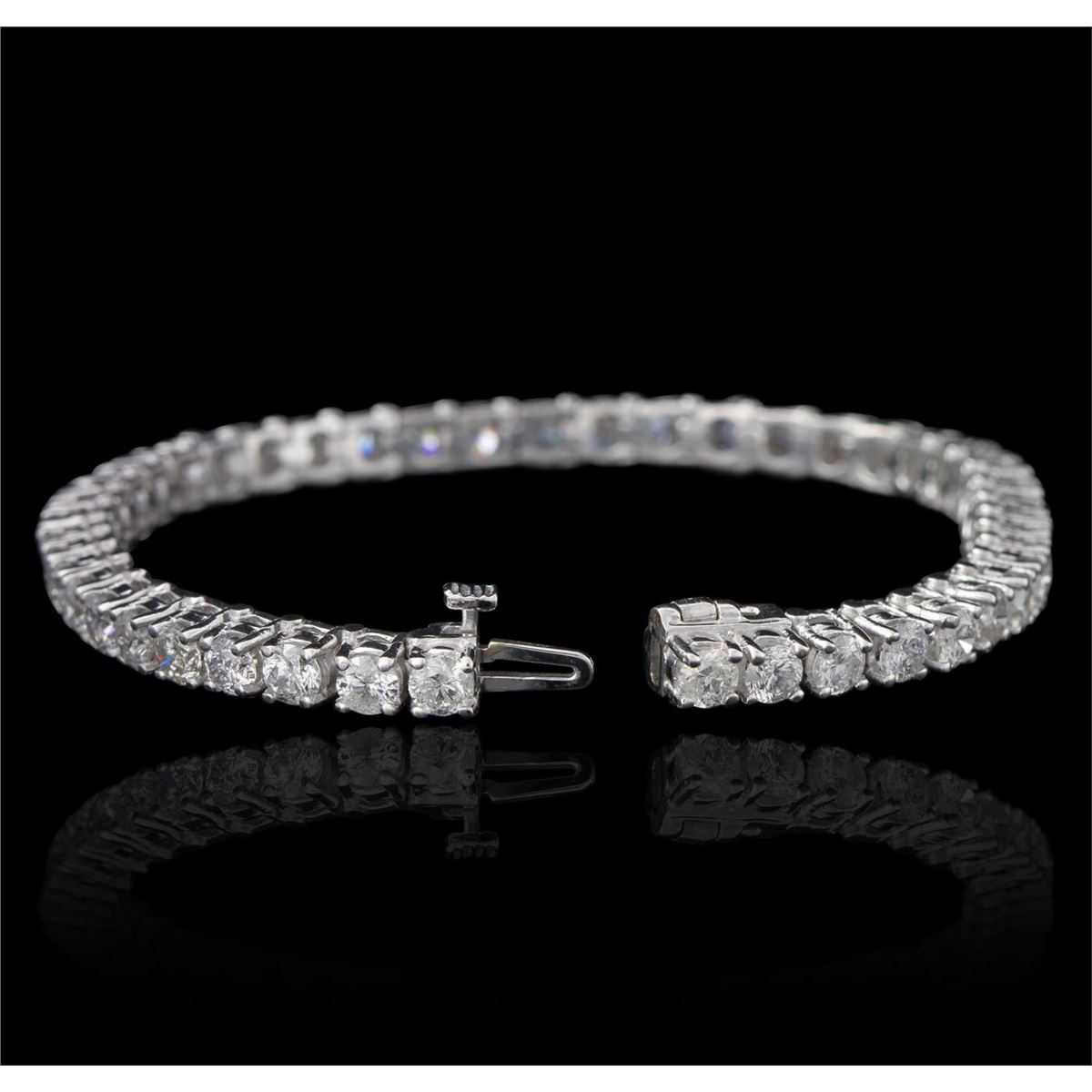 One electronically tested 14KT white gold ladies cast & assembled diamond tennis bracelet with a bright polish finish. Seven inch length bracelet composed of a flexible ribbon of diamonds, terminating in a concealed clasp with safety. Identified with markings of "14K". Condition is new, good workmanship. Tennis bracelets & necklaces got their unusual name from an incident involving the U.S. professional tennis player Chris Evert during a tennis match in the 1980's. Evert had been wearing an expensive diamond bracelet, an inline string of individually-set diamonds. Previously these bracelets were known as eternity bracelets. When the clasp snapped during play, she asked the officials to stop the tennis match until the bracelet could be found. Since that day, bracelets and necklaces featuring an inline string of diamonds have been called tennis bracelets and tennis necklaces. Containing: Forty-five prong set round brilliant cut diamonds, measuring 3.80 - 3.70 x 2.25mm (depth est.) approximate total weight of 45 Stones = 9.29ct. Graded in the setting. Clarity I-1 to 1-2. Color H - J. Total Weight of Diamonds 9.29ct. Total Weight of Tennis Bracelet 17.99gm. AIG Appraised at $26,230.00.
