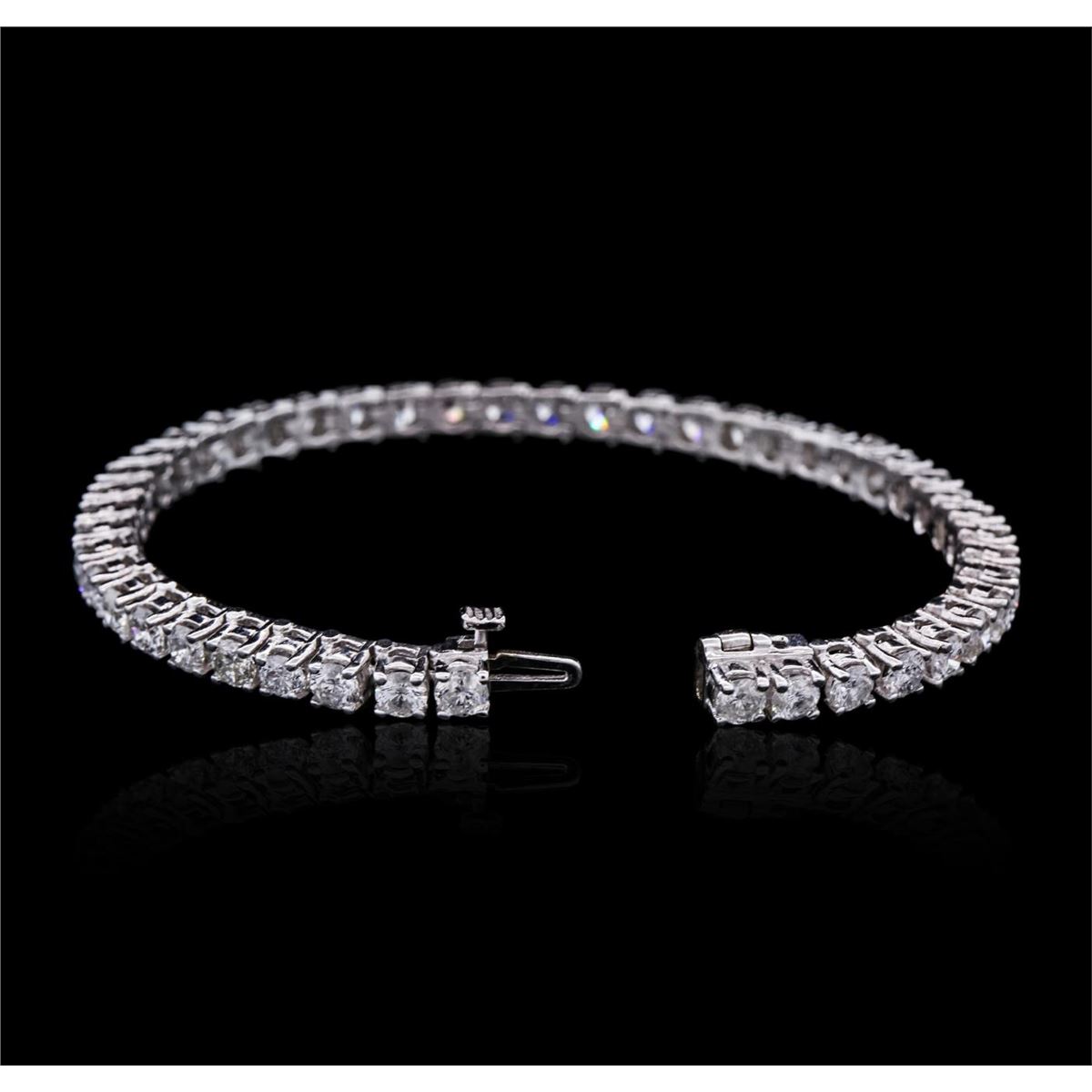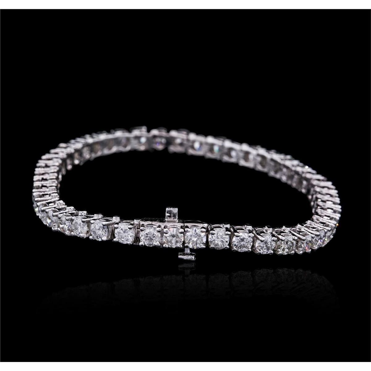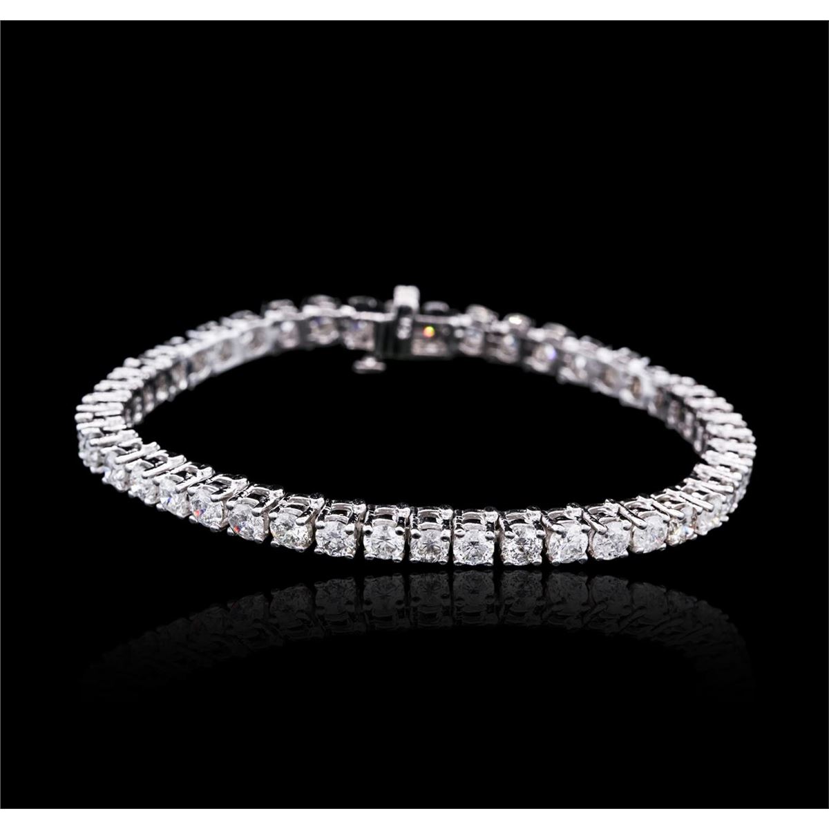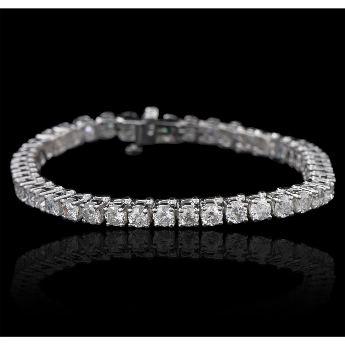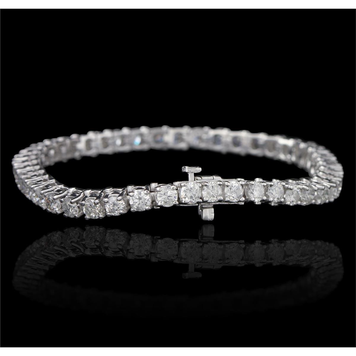 One electronically tested 14KT white gold ladies cast & assembled diamond tennis bracelet with a bright polish finish. Seven inch length bracelet composed of a flexible ribbon of diamonds, terminating in a concealed clasp with safety. Identified with markings of "14K". Condition is new, good workmanship. Tennis bracelets & necklaces got their unusual name from an incident involving the U.S. professional tennis player Chris Evert during a tennis match in the 1980's. Evert had been wearing an expensive diamond bracelet, an inline string of individually-set diamonds. Previously these bracelets were known as eternity bracelets. When the clasp snapped during play, she asked the officials to stop the tennis match until the bracelet could be found. Since that day, bracelets and necklaces featuring an inline string of diamonds have been called tennis bracelets and tennis necklaces. Containing: Forty-five prong set round brilliant cut diamonds, measuring 3.80 - 3.70 x 2.25mm (depth est.) approximate total weight of 45 Stones = 9.29ct. Graded in the setting. Clarity I-1 to 1-2. Color H - J. Total Weight of Diamonds 9.29ct. Total Weight of Tennis Bracelet 17.99gm. AIG Appraised at $26,230.00.