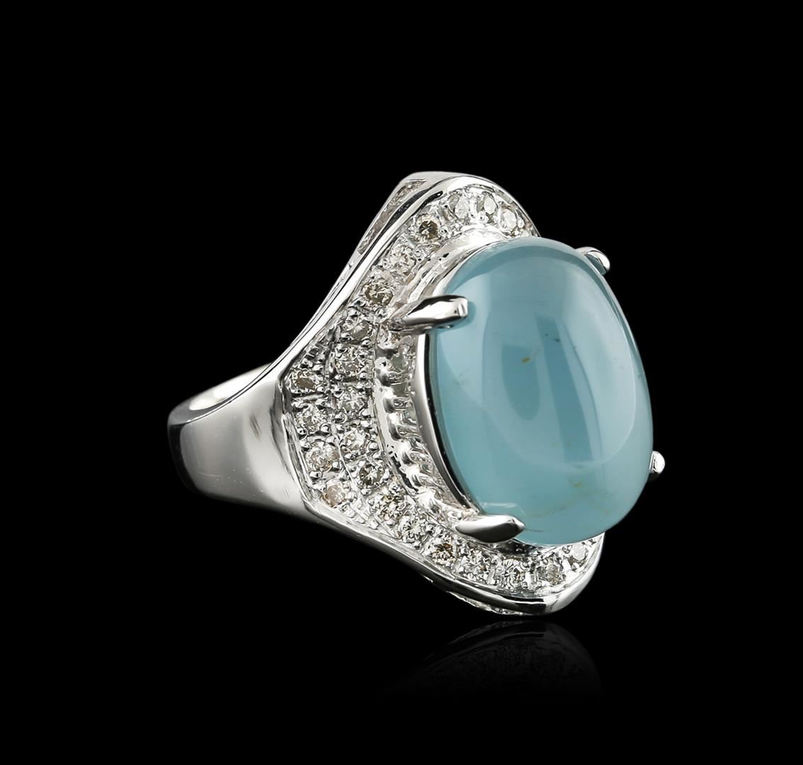 One electronically tested 14KT white gold ladies cast aquamarine and diamond ring with a tapered shank with a bright polish finish. Identified with markings of "14K". Condition is new. Containing: One prong set oval cabochon cut natural aquamarine, measuring 15.00 x 10.64 x 6.92mm, approximate weight of 9.31ct., clarity is heavily included, type I, medium light, very slightly grayish, blue color, (GIA B 4/3), cut is good. Thirty-Six prong set round brilliant cut diamonds, measuring 1.50 - 1.50 x 0.90mm (depth est.) approximate total weight of 36 Stones = 0.44ct. Clarity: SI-1 to I-1. Color: I - K, Cut is Good. Diamonds and colored gemstones are graded in the mounting, unless otherwise stated. Colored gemstones are presumed to have been subjected to commonly used enhancement processes. Total Weight of Colored Stones 9.31ct. Total Weight of Diamonds 0.44ct. Total Weight of Ring 10.80 grams. GGL Appraised at $3,665.00.