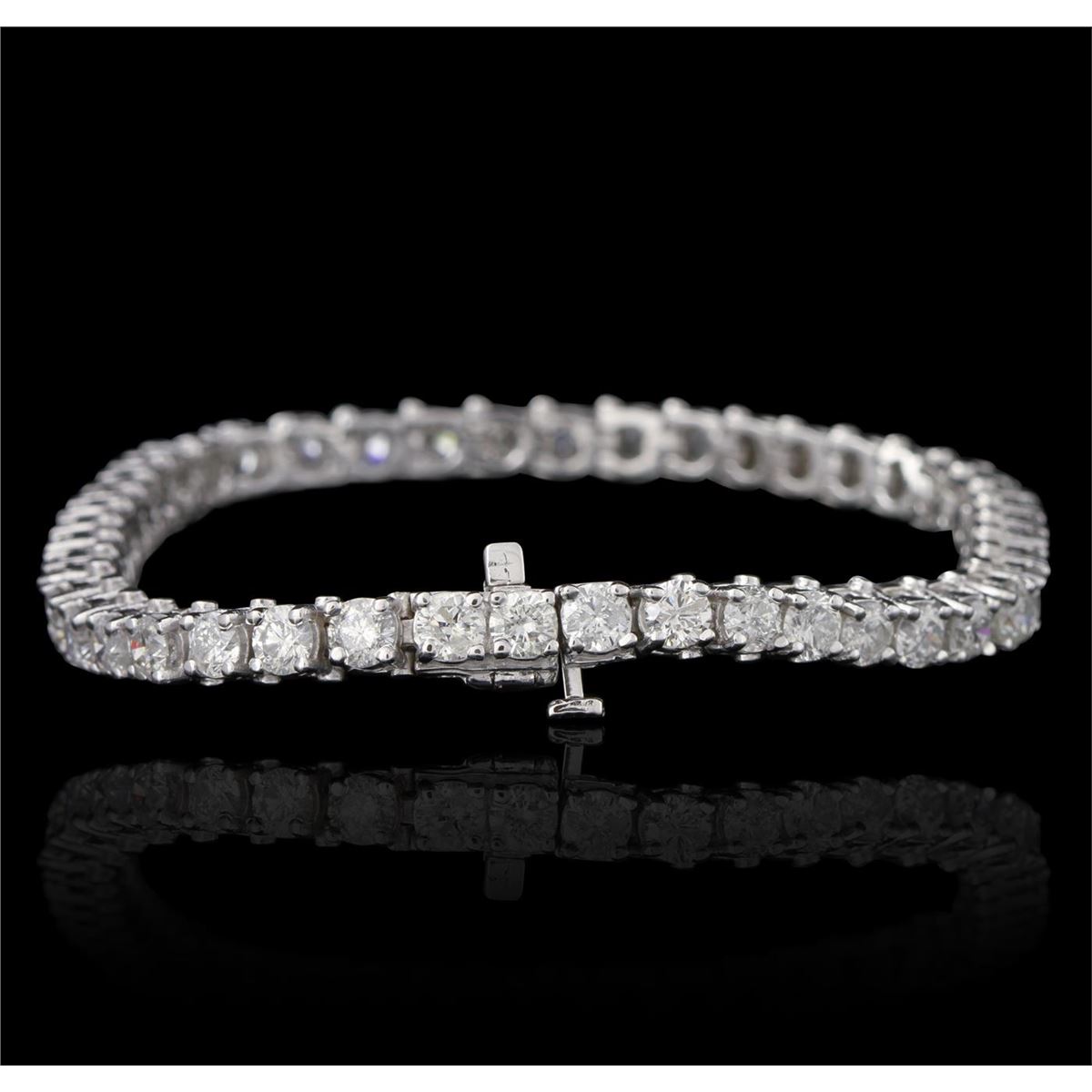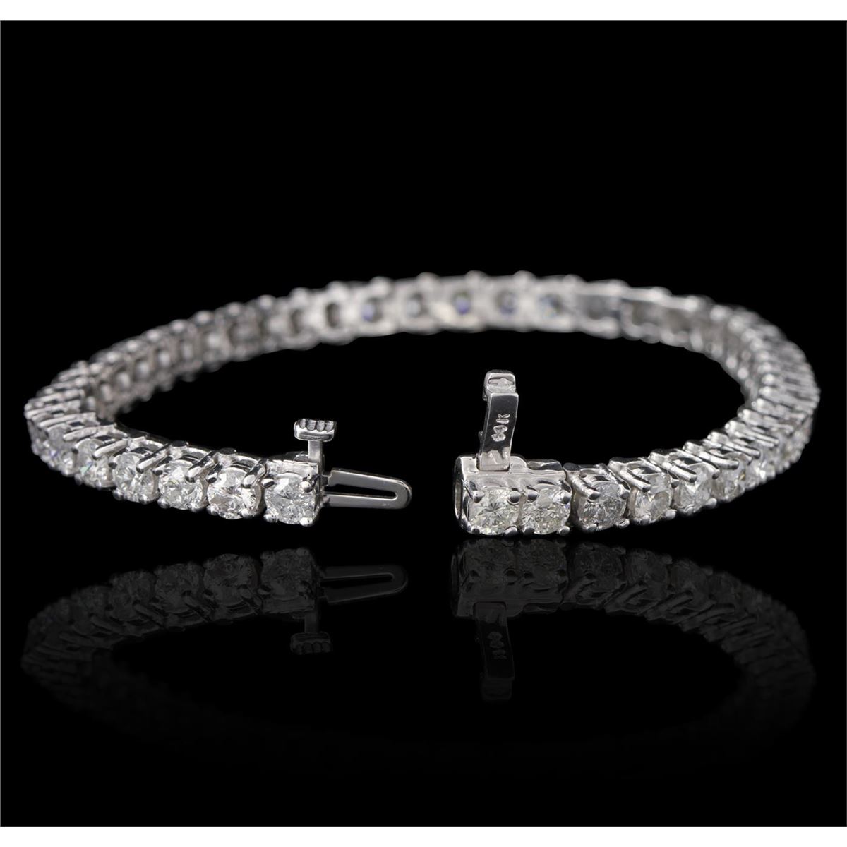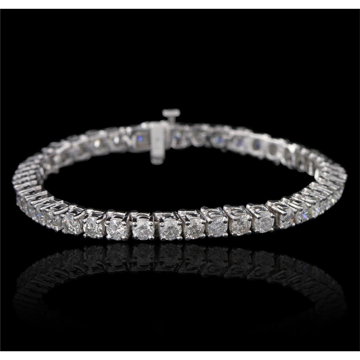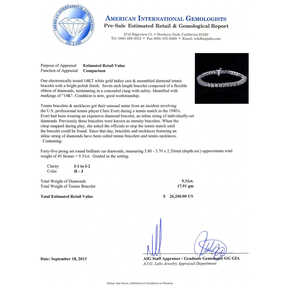 One electronically tested 14KT white gold ladies cast & assembled diamond tennis bracelet with a bright polish finish. Seven inch length bracelet composed of a flexible ribbon of diamonds, terminating in a concealed clasp with safety. Identified with markings of "14K". Condition is new, good workmanship. Tennis bracelets & necklaces got their unusual name from an incident involving the U.S. professional tennis player Chris Evert during a tennis match in the 1980's. Evert had been wearing an expensive diamond bracelet, an inline string of individually-set diamonds. Previously these bracelets were known as eternity bracelets. When the clasp snapped during play, she asked the officials to stop the tennis match until the bracelet could be found. Since that day, bracelets and necklaces featuring an inline string of diamonds have been called tennis bracelets and tennis necklaces. Containing: Forty-five prong set round brilliant cut diamonds, measuring 3.80 - 3.70 x 2.20mm (depth est.) approximate total weight of 45 Stones = 9.31ct. Graded in the setting. Clarity I-1 to 1-2. Color H -- J. Total Weight of Diamonds 9.31ct. Total Weight of Tennis Bracelet 17.91gm. AIG Appraised at $26,260.00.