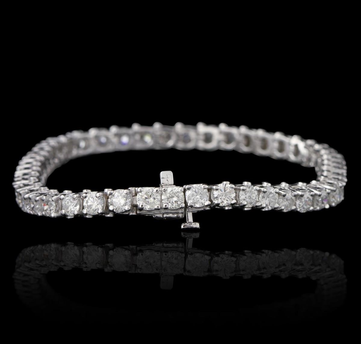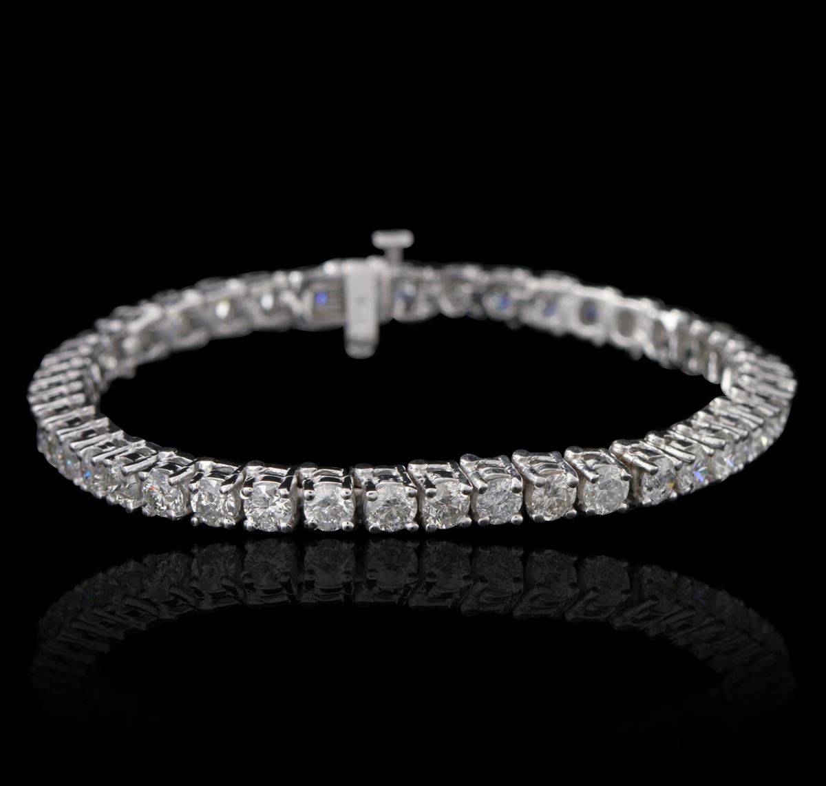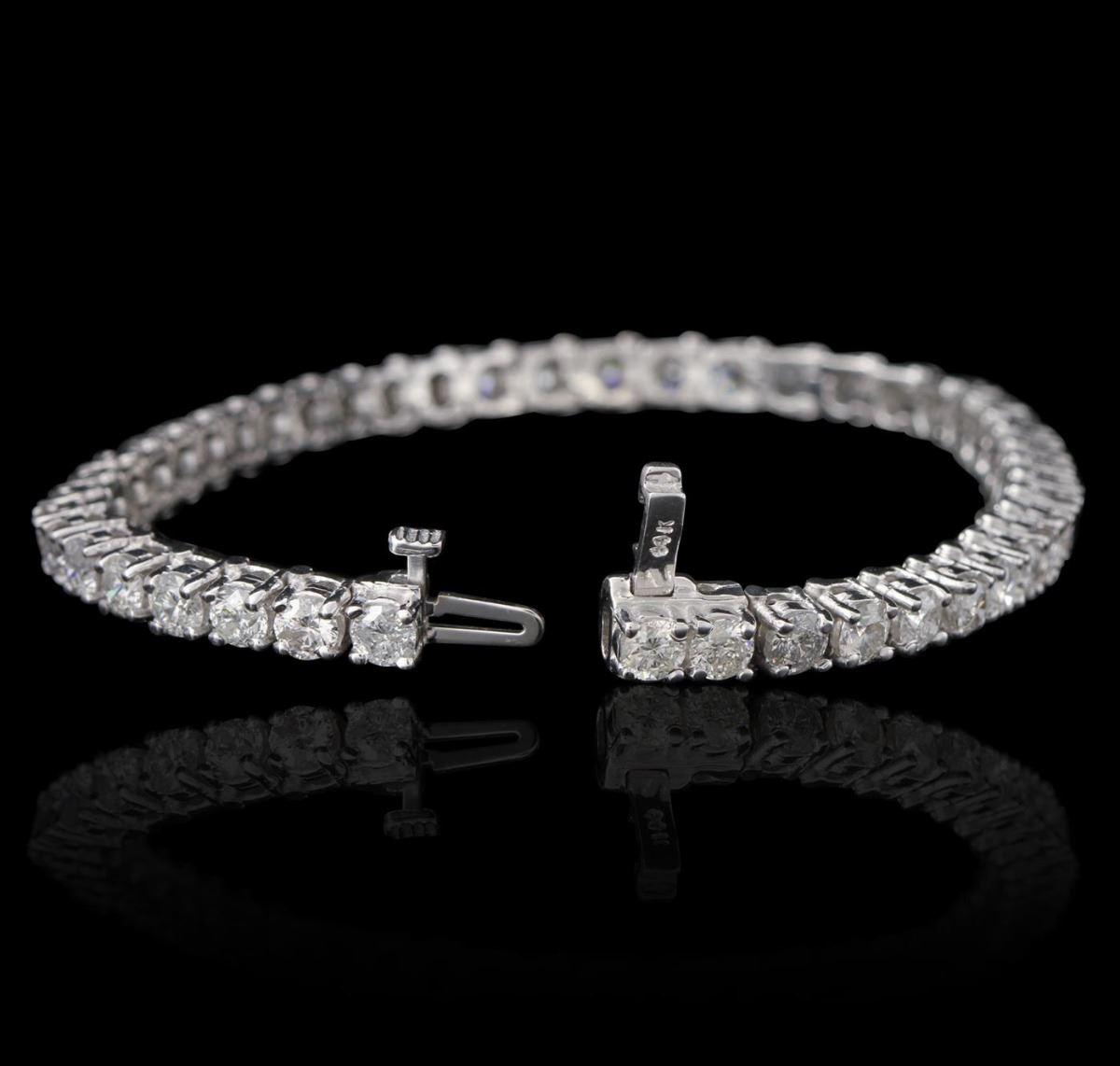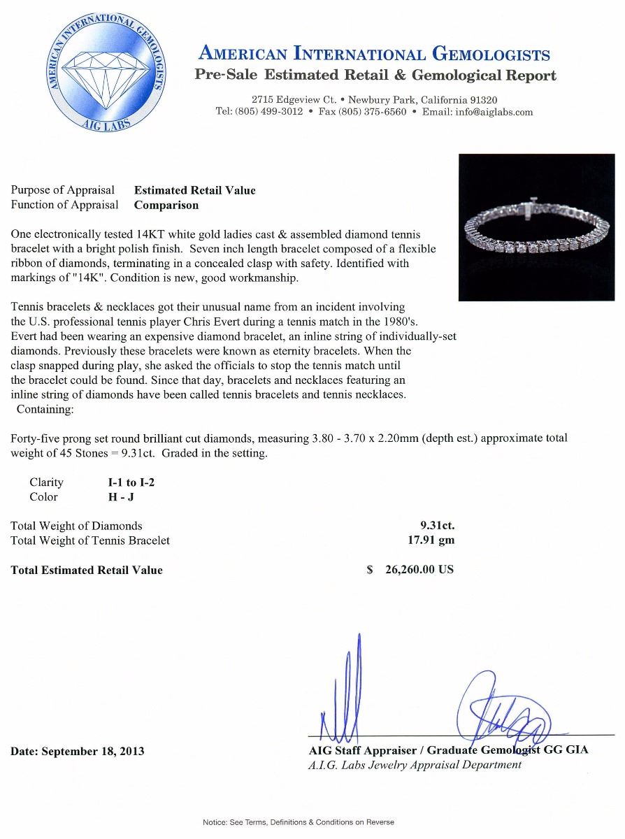 One electronically tested 14KT white gold ladies cast & assembled diamond tennis bracelet with a bright polish finish. Seven inch length bracelet composed of a flexible ribbon of diamonds, terminating in a concealed clasp with safety. Identified with markings of "14K". Condition is new, good workmanship. Tennis bracelets & necklaces got their unusual name from an incident involving the U.S. professional tennis player Chris Evert during a tennis match in the 1980's. Evert had been wearing an expensive diamond bracelet, an inline string of individually-set diamonds. Previously these bracelets were known as eternity bracelets. When the clasp snapped during play, she asked the officials to stop the tennis match until the bracelet could be found. Since that day, bracelets and necklaces featuring an inline string of diamonds have been called tennis bracelets and tennis necklaces. Containing: Forty-five prong set round brilliant cut diamonds, measuring 3.80 - 3.70 x 2.20mm (depth est.) approximate total weight of 45 Stones = 9.31ct. Graded in the setting. Clarity I-1 to 1-2. Color H -- J. Total Weight of Diamonds 9.31ct. Total Weight of Tennis Bracelet 17.91gm. AIG Appraised at $26,260.00.