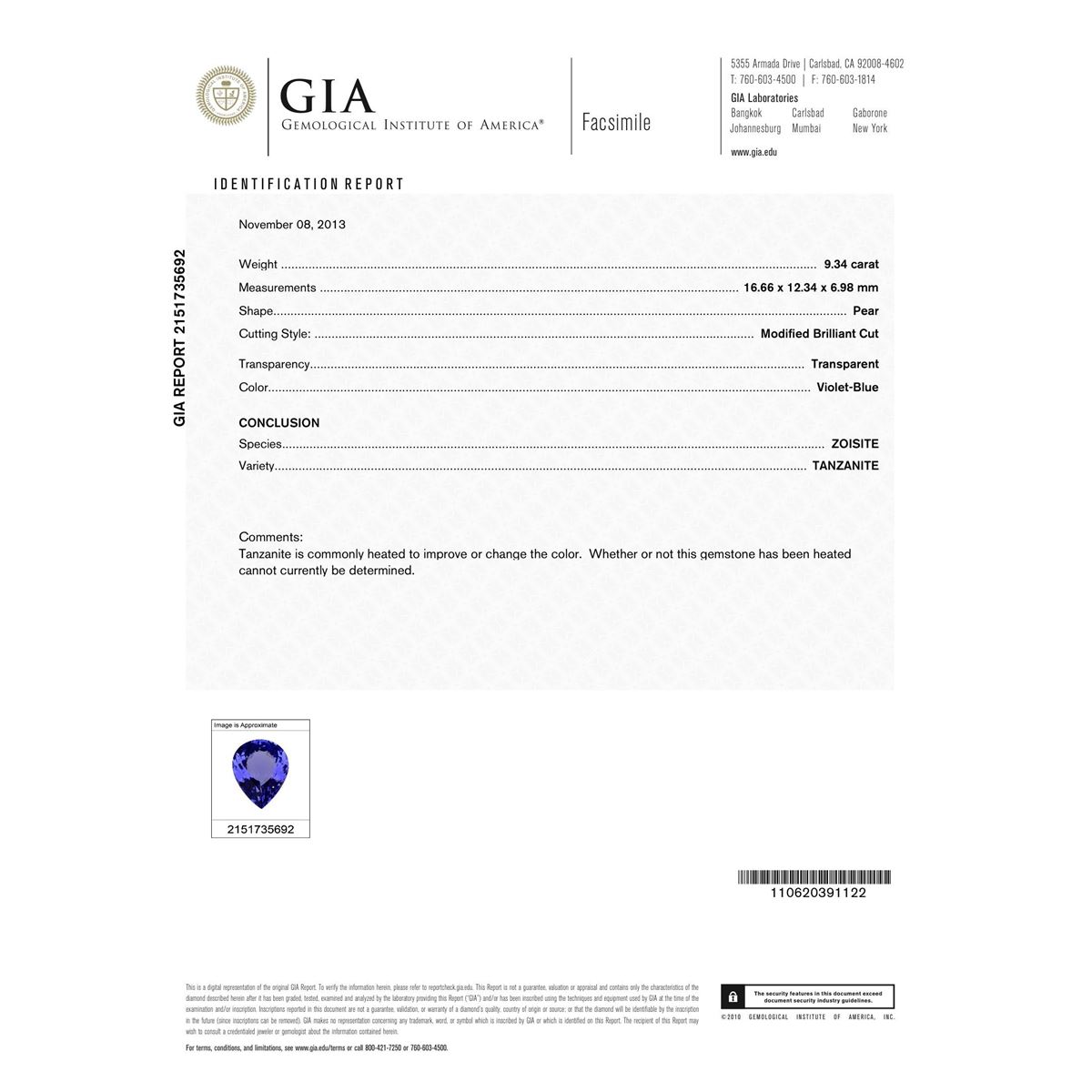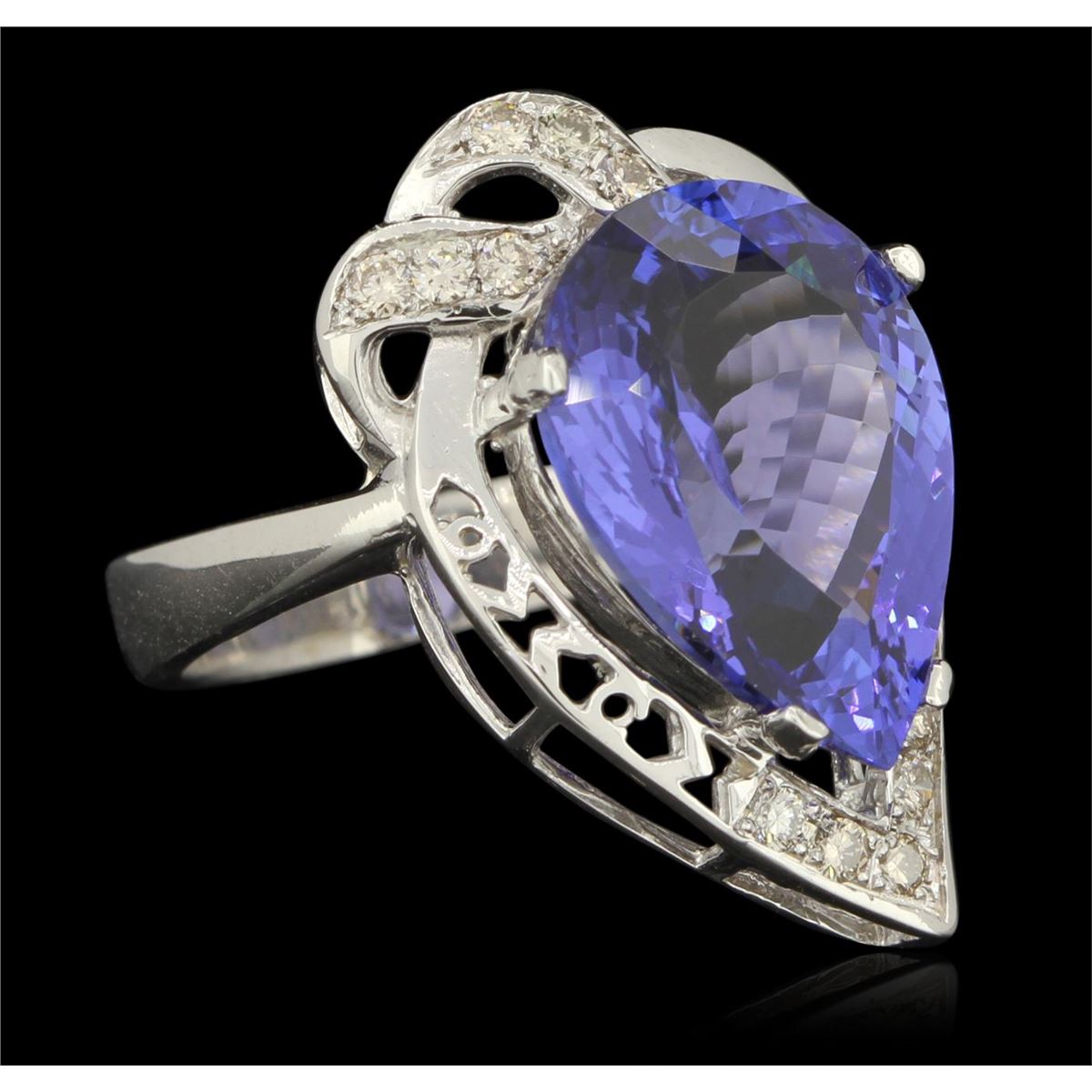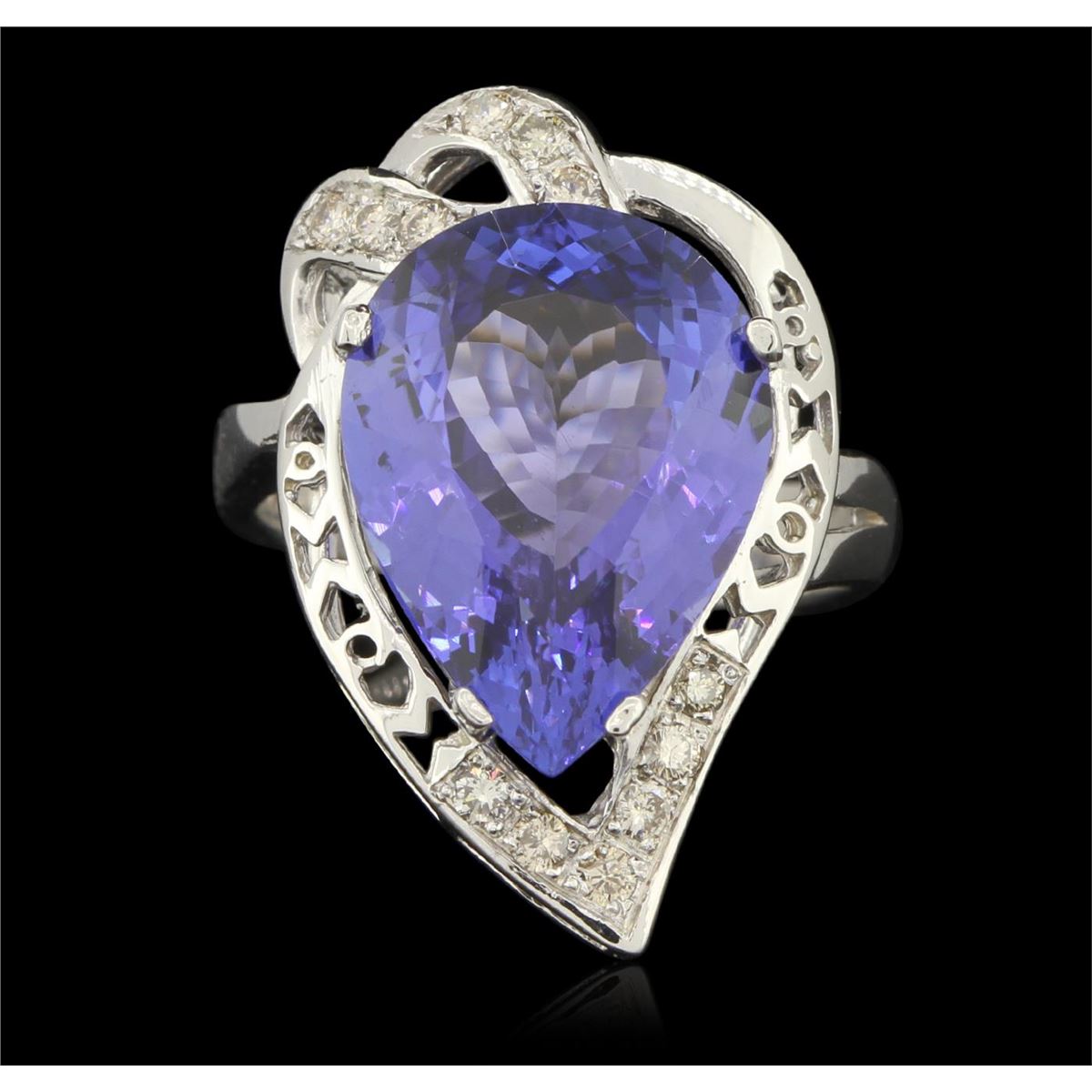 One electronically tested 14KT white gold ladies cast tanzanite and diamond ring with a bright polish finish. Condition is new, good workmanship. The featured tanzanite is set within an elaborate diamond lattice gallery, completed by a four millimeter wide band. Identified with markings of "K14". Containing: One prong set pear modified brilliant cut natural tanzanite, measuring 16.66 x 12.34 x 6.98mm, exact weight 9.34ct., type I Clarity is eye clean, type I, medium dark, very slightly grayish, Violet-Blue. Color, (GIA VB 6/3), cut is good. Transmitting light with no distortion, transparent. GIA Colored Stone Grading Report attached. Graded loose prior to setting in the GIA Laboratory, Report # 2151735692. Tanzanite is a very rare gemstone that is only found in the country of Tanzania. Originally discovered in 1967. Tiffany & Company, named the stone Tanzanite. It is found in the Usumburu Mountains that border the Umba Valley of northern Tanzania. Tanzanite occurs in gray, brown, violet, blue, reddish-purple, & green. The gem is interesting because of its exceptional pleochroism. Rotated in different directions a tanzanite will exhibit multiple changes of color. Tanzanite has a low tolerance to ultrasonic cleaning, and should not be cleaned using this method. Twelve prong set round brilliant cut diamonds, measuring 1.80 - 1.70 x 1.05mm (depth est.) approximate total weight of 12 Stones = 0.31ct. Faint brown secondary color throughout. Graded in the setting. Clarity SI-1 to SI-2. Color J - L. Total Weight of Colored Stones 9.34ct. Total Weight of Diamonds 0.31ct. Total Weight of Ring 9.00gm. AIG Appraised at $23,955.00.