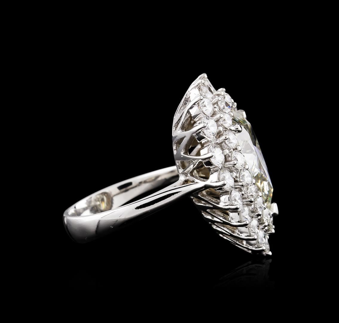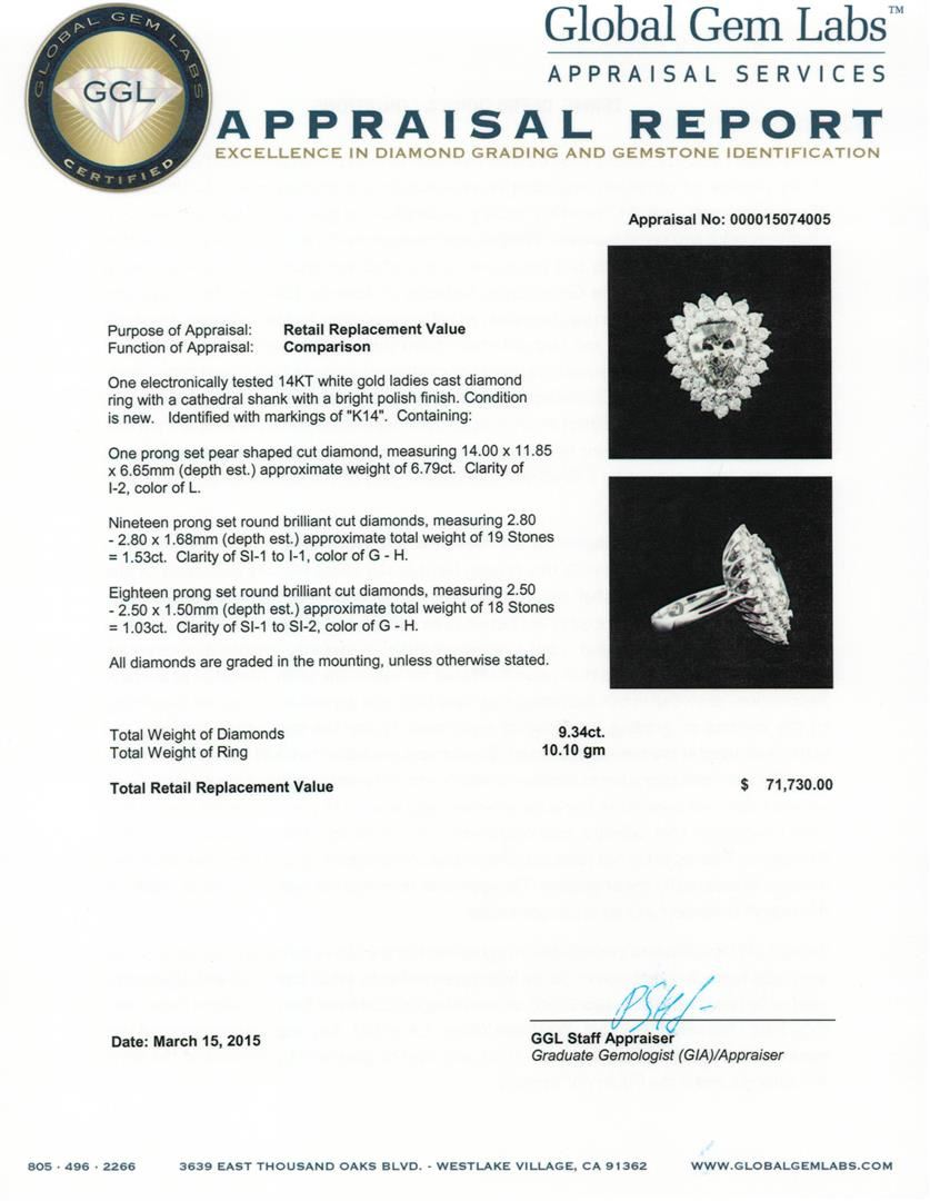 One electronically tested 14KT white gold ladies cast diamond ring with a cathedral shank with a bright polish finish. Identified with markings of "K14". Condition is new. Containing: One prong set pear shaped cut diamond, measuring 14.00 x 11.85 x 6.65mm (depth est.) approximate weight of 6.79ct. Clarity of I-2, Color of L. Nineteen prong set round brilliant cut diamonds, measuring 2.80 - 2.80 x 1.68mm (depth est.) approximate total weight of 19 Stones = 1.53ct. Clarity of SI-1 to I-1, Color of G - H. Eighteen prong set round brilliant cut diamonds, measuring 2.50 - 2.50 x 1.50mm (depth est.) approximate total weight of 18 Stones = 1.03ct. Clarity of SI-1 to SI-2, Color of G - H. All diamonds are graded in the mounting, unless otherwise stated. Total Weight of Diamonds 9.34ct. Total Weight of Ring 10.10 grams. GGL Appraised at $71,730.00.
