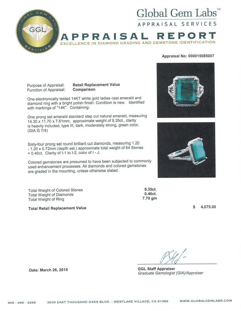 One electronically tested 14KT white gold ladies cast emerald and diamond ring with a bright polish finish. Identified with markings of "14K". Condition is new. Containing: One prong set emerald standard step cut natural emerald, measuring 14.30 x 11.70 x 7.61mm, approximate weight of 9.35ct., clarity is heavily included, type III, dark, moderately strong, green color, (GIA G 7/4)Sixty-Four prong set round brilliant cut diamonds, measuring 1.20 - 1.20 x 0.72mm (depth est.) approximate total weight of 64 Stones = 0.40ct. Clarity: I-1 to I-2. Color: I - J. Colored gemstones are presumed to have been subjected to commonly used enhancement processes. All diamonds and colored gemstones are graded in the mounting, unless otherwise stated. Total Weight of Colored Stones 9.35ct. Total Weight of Diamonds 0.40ct. Total Weight of Ring 7.70 grams. GGL Appraised at $4,075.00.