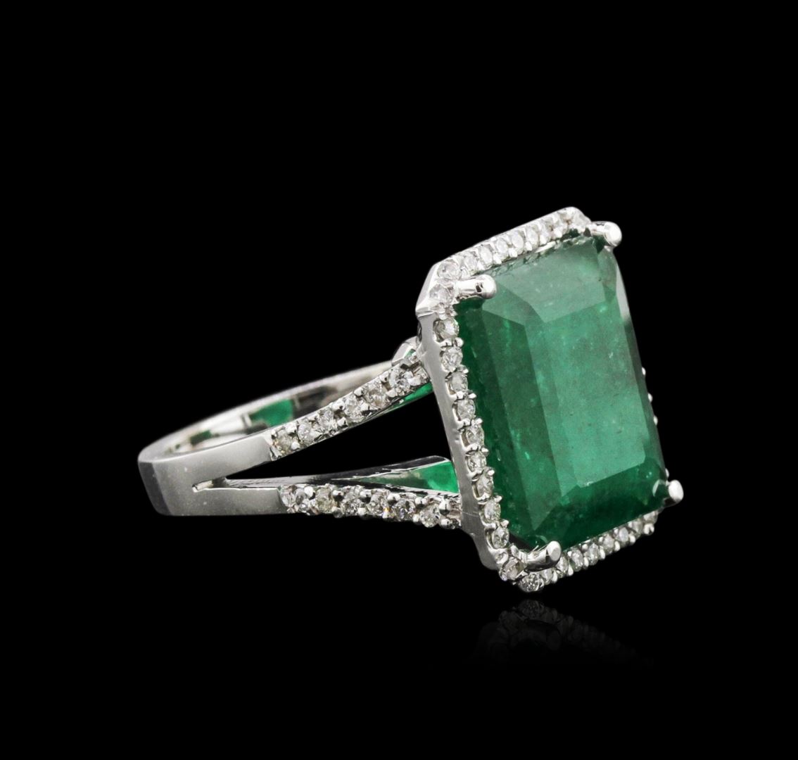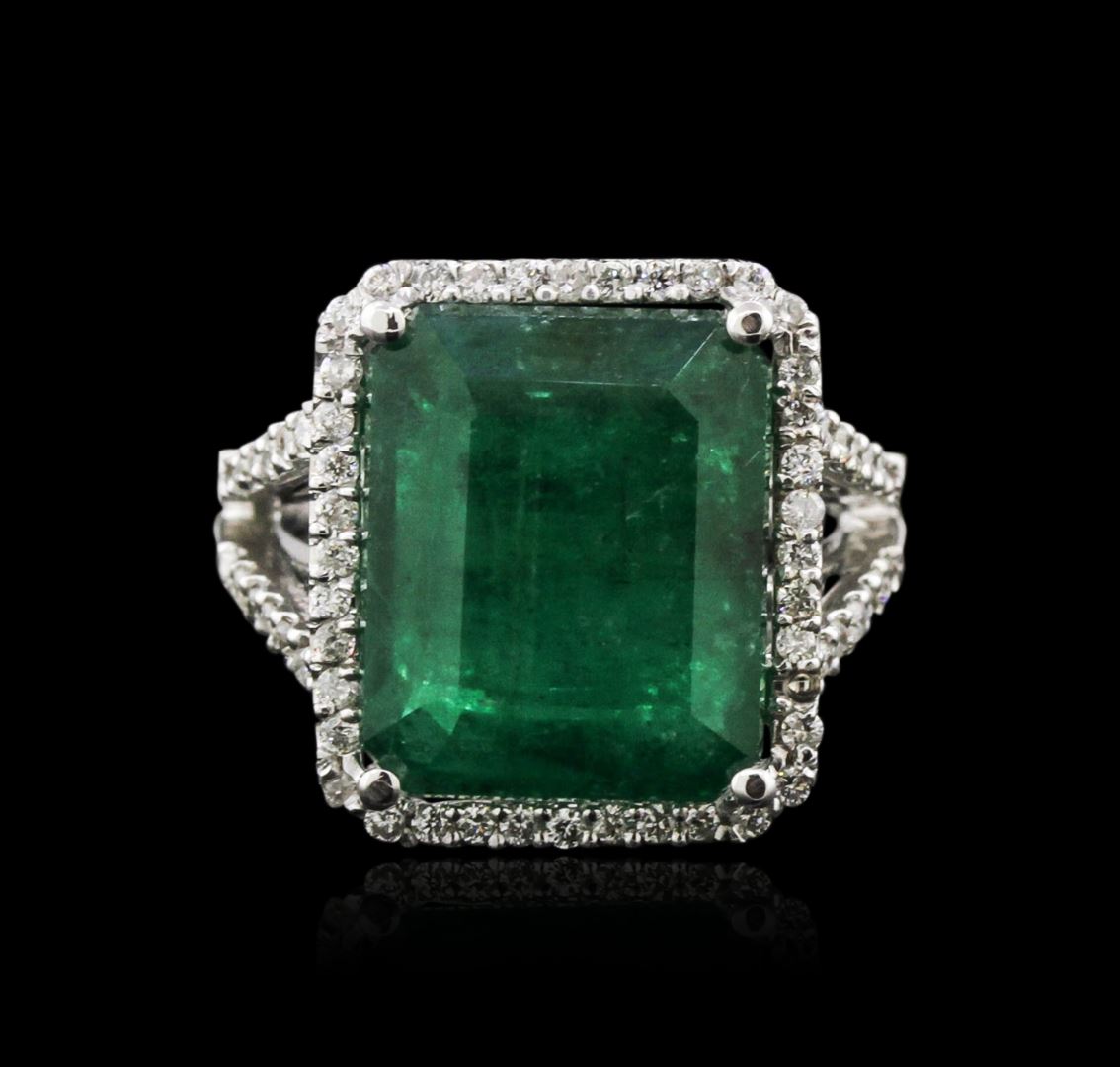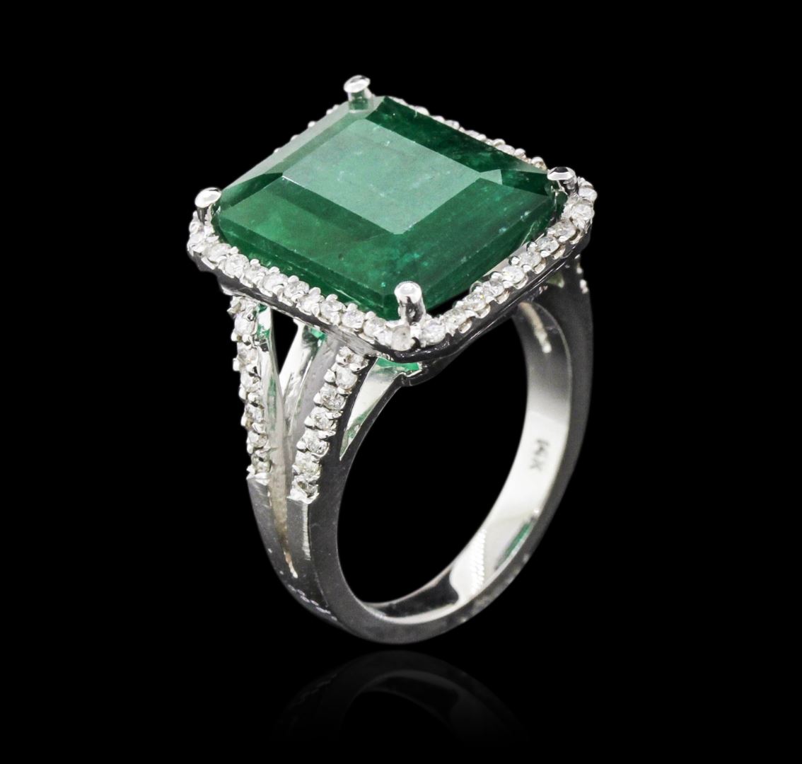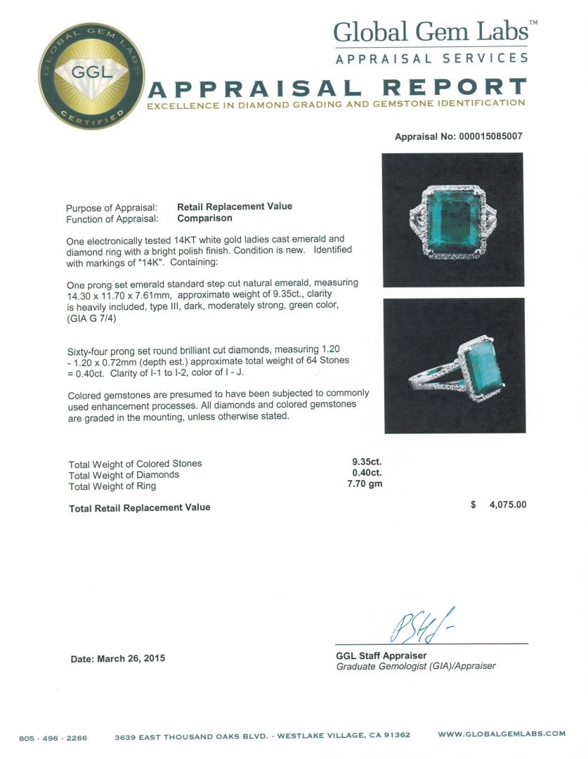 One electronically tested 14KT white gold ladies cast emerald and diamond ring with a bright polish finish. Identified with markings of "14K". Condition is new. Containing: One prong set emerald standard step cut natural emerald, measuring 14.30 x 11.70 x 7.61mm, approximate weight of 9.35ct., clarity is heavily included, type III, dark, moderately strong, green color, (GIA G 7/4)Sixty-Four prong set round brilliant cut diamonds, measuring 1.20 - 1.20 x 0.72mm (depth est.) approximate total weight of 64 Stones = 0.40ct. Clarity: I-1 to I-2. Color: I - J. Colored gemstones are presumed to have been subjected to commonly used enhancement processes. All diamonds and colored gemstones are graded in the mounting, unless otherwise stated. Total Weight of Colored Stones 9.35ct. Total Weight of Diamonds 0.40ct. Total Weight of Ring 7.70 grams. GGL Appraised at $4,075.00.