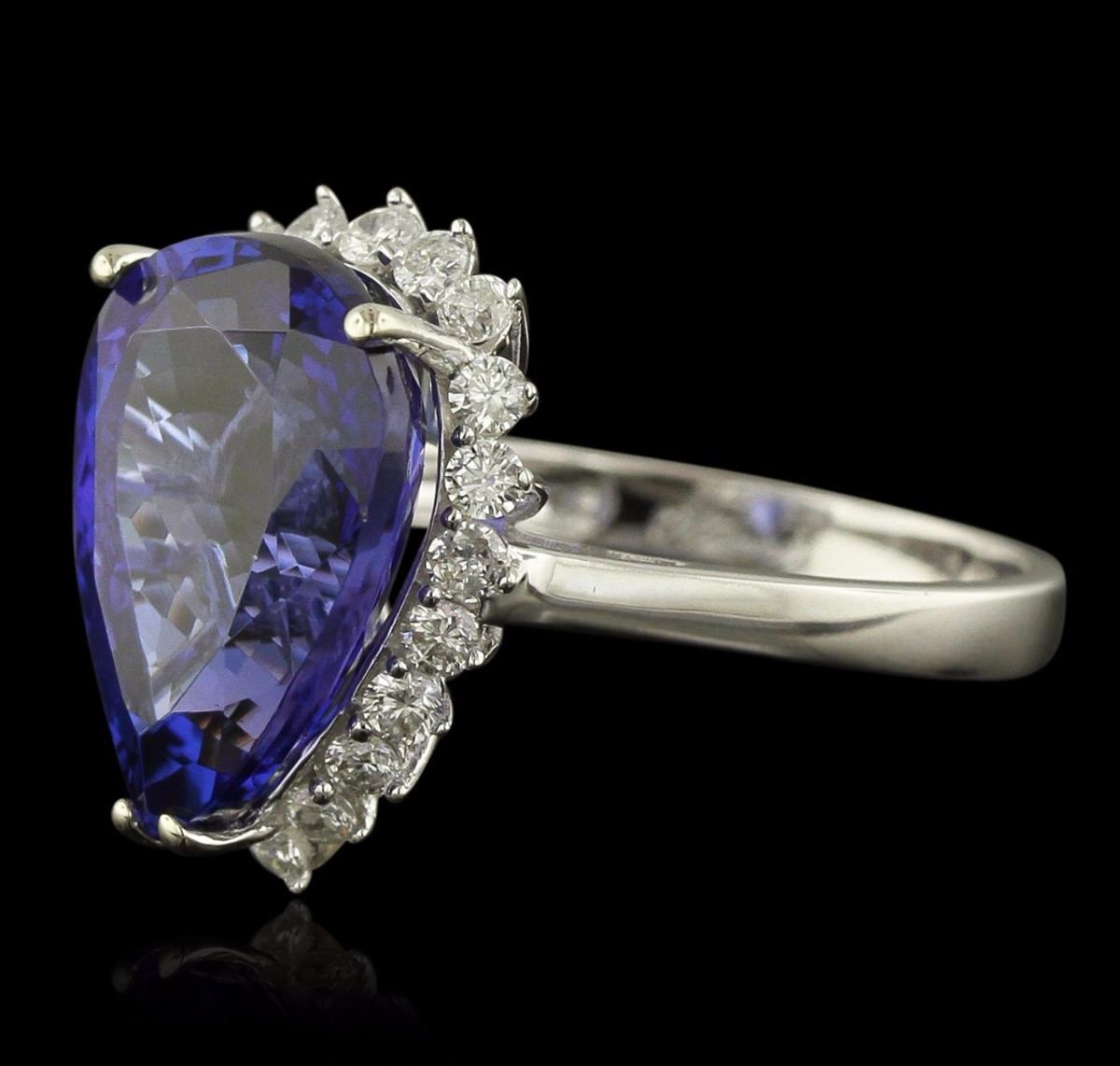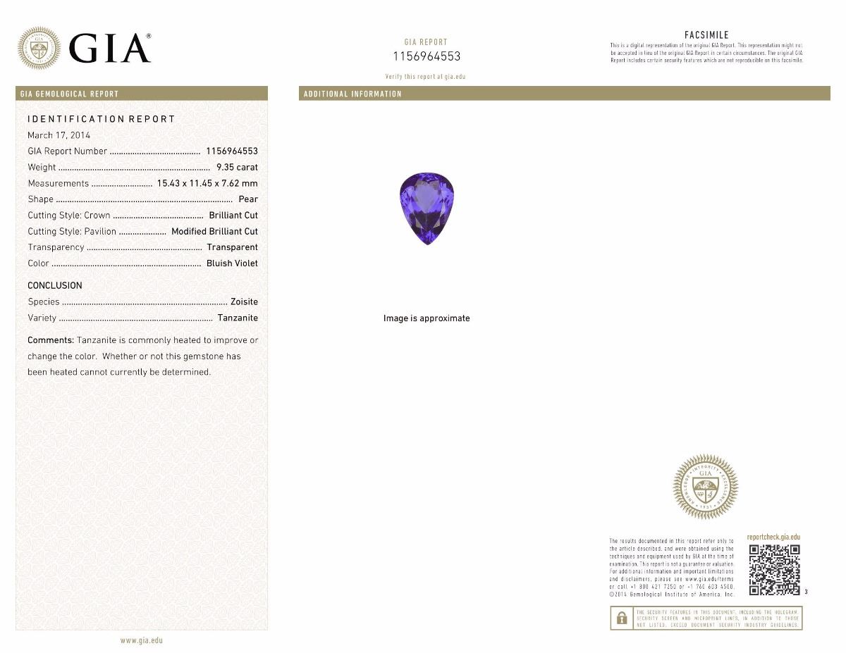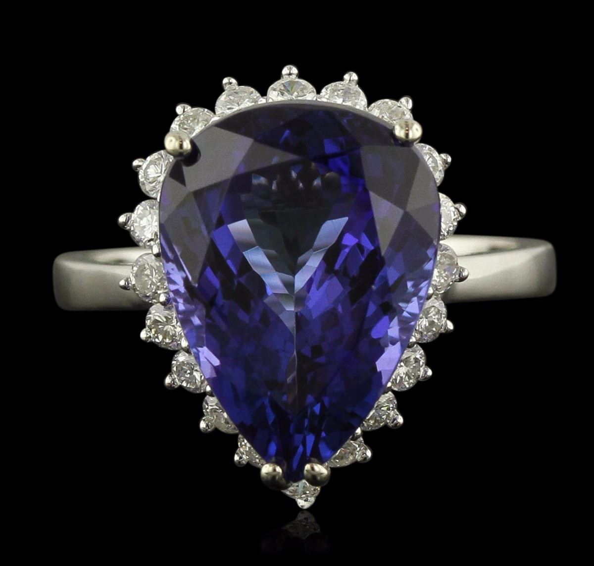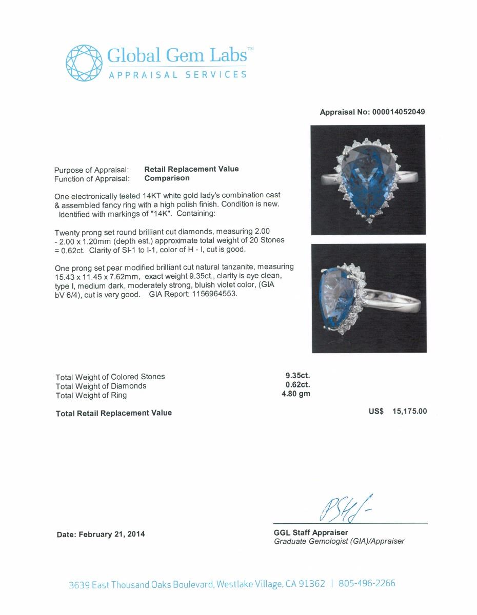 One electronically tested 14KT white gold Ladies combination cast & assembled fancy ring with a high polish finish. Condition is new. Identified with markings of "14K". Containing: Twenty prong set round brilliant cut diamonds, measuring 2.00 - 2.00 x 1.20mm (depth est.) approximate. Total Weight of 20 Stones = 0.62ct. Clarity: SI-1 to I-1. Color: H - I, Cut is Good. One prong set pear modified brilliant cut natural tanzanite, measuring 15.43 x 11.45 x 7.62mm, exact weight 9.35ct., clarity is eye clean, type I, medium dark, moderately strong, bluish violet color, (GIA bV 6/4), cut is very good. GIA Report: 1156964553.Total Weight of Colored Stones 9.35ct. Total Weight of Diamonds 0.62ct. Total Weight of Ring 4.80 grams. GGL Appraised at $15,175.00.