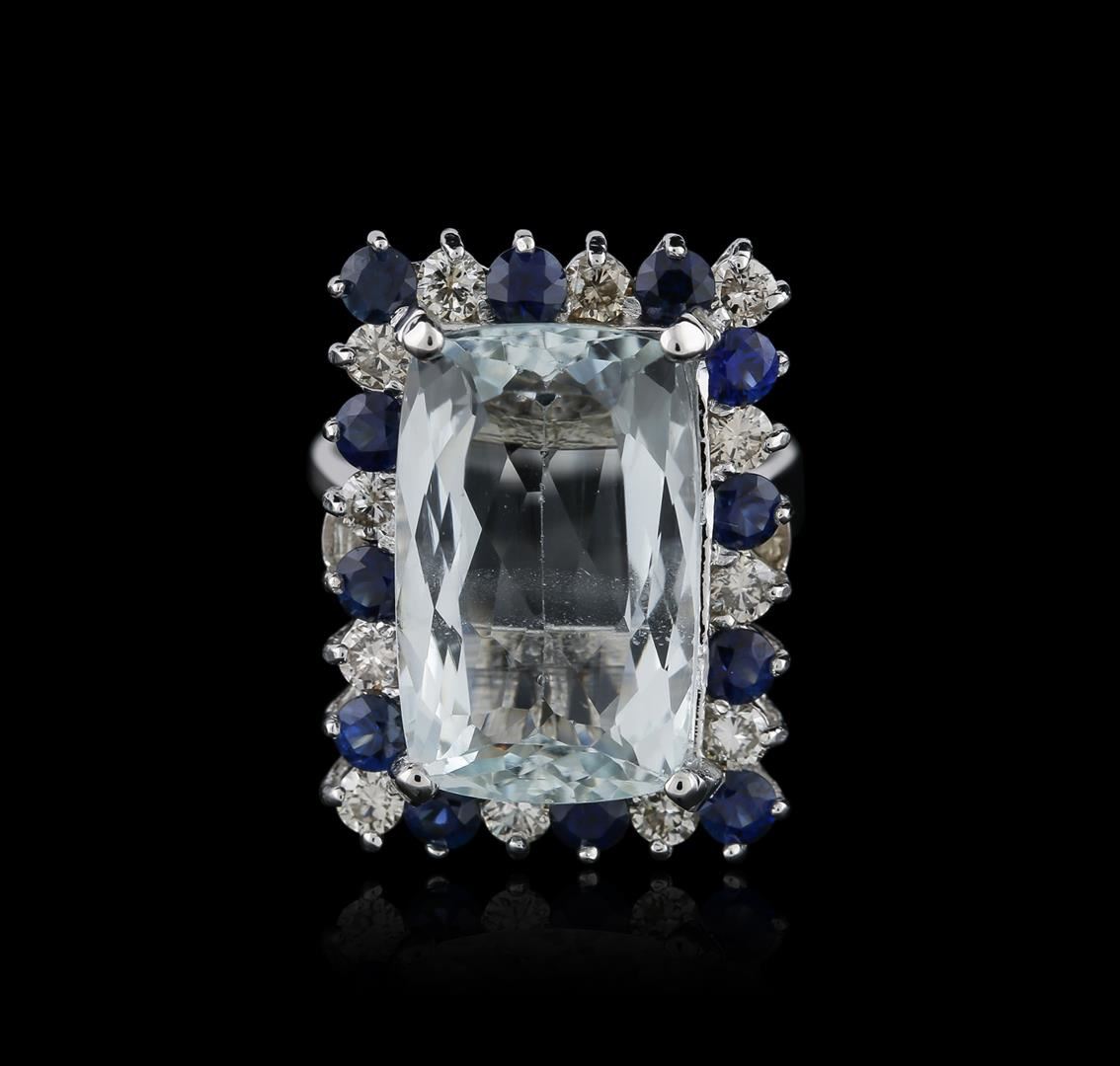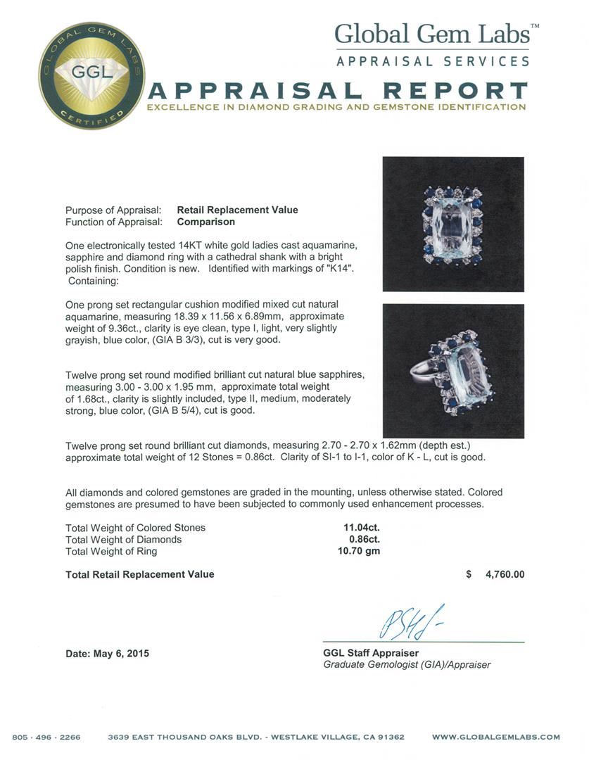 One electronically tested 14KT white gold ladies cast aquamarine, sapphire and diamond ring with a cathedral shank with a bright polish finish. Identified with markings of "K14". Condition is new. Containing: One prong set rectangular cushion modified mixed cut natural aquamarine, measuring 18.39 x 11.56 x 6.89mm, approximate weight of 9.36ct., clarity is eye clean, type I, light, very slightly grayish, blue color, (GIA B 3/3), cut is very good. Twelve prong set round modified brilliant cut natural blue sapphires, measuring 3.00 - 3.00 x 1.95 mm, approximate total weight of 1.68ct., clarity is slightly included, type II, medium, moderately strong, blue color, (GIA B 5/4), cut is good. Twelve prong set round brilliant cut diamonds, measuring 2.70 - 2.70 x 1.62mm (depth est.) approximate total weight of 12 Stones = 0.86ct. Clarity: SI-1 to I-1. Color: K - L, Cut is Good. All diamonds and colored gemstones are graded in the mounting, unless otherwise stated. Colored gemstones are presumed to have been subjected to commonly used enhancement processes.. Total Weight of Colored Stones 11.04ct. Total Weight of Diamonds 0.86ct. Total Weight of Ring 10.70 grams. GGL Appraised at $4,760.00.