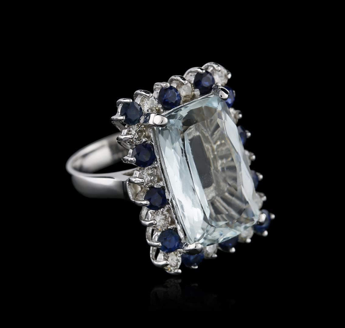 One electronically tested 14KT white gold ladies cast aquamarine, sapphire and diamond ring with a cathedral shank with a bright polish finish. Identified with markings of "K14". Condition is new. Containing: One prong set rectangular cushion modified mixed cut natural aquamarine, measuring 18.39 x 11.56 x 6.89mm, approximate weight of 9.36ct., clarity is eye clean, type I, light, very slightly grayish, blue color, (GIA B 3/3), cut is very good. Twelve prong set round modified brilliant cut natural blue sapphires, measuring 3.00 - 3.00 x 1.95 mm, approximate total weight of 1.68ct., clarity is slightly included, type II, medium, moderately strong, blue color, (GIA B 5/4), cut is good. Twelve prong set round brilliant cut diamonds, measuring 2.70 - 2.70 x 1.62mm (depth est.) approximate total weight of 12 Stones = 0.86ct. Clarity: SI-1 to I-1. Color: K - L, Cut is Good. All diamonds and colored gemstones are graded in the mounting, unless otherwise stated. Colored gemstones are presumed to have been subjected to commonly used enhancement processes.. Total Weight of Colored Stones 11.04ct. Total Weight of Diamonds 0.86ct. Total Weight of Ring 10.70 grams. GGL Appraised at $4,760.00.