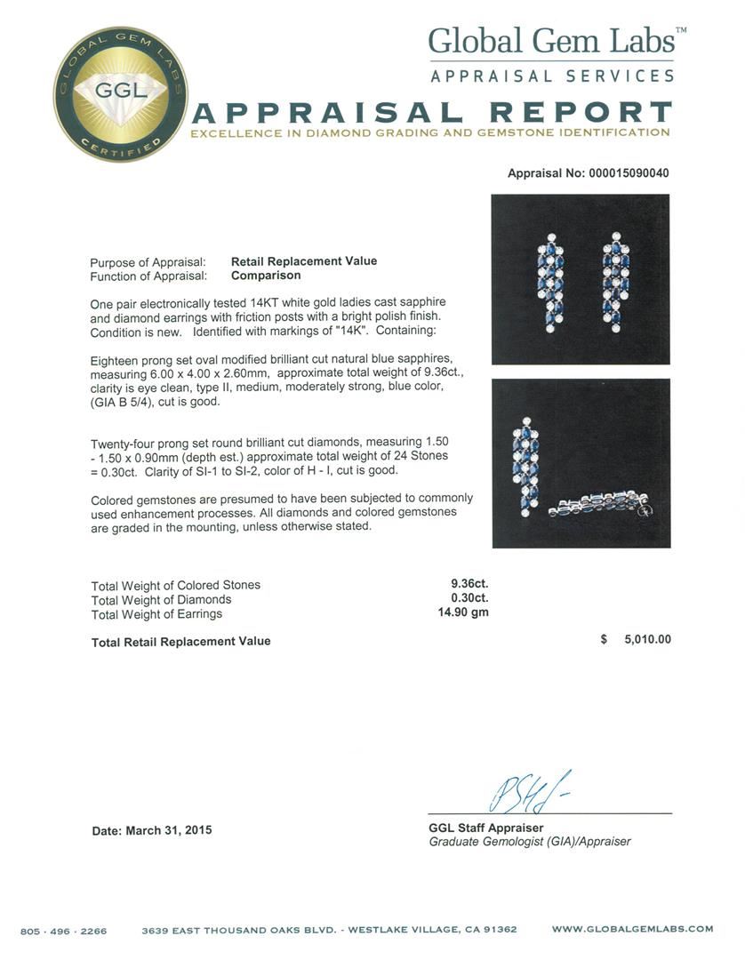 One pair electronically tested 14KT white gold ladies cast sapphire and diamond earrings with friction posts with a bright polish finish. Identified with markings of "14K". Condition is new. Containing: Eighteen prong set oval modified brilliant cut natural blue sapphires, measuring 6.00. x 4.00. x 2.60mm, approximate total weight of 9.36ct., clarity is eye clean, type II, medium, moderately strong, blue color, (GIA B 5/4), cut is good. Twenty-Four prong set round brilliant cut diamonds, measuring 1.50 - 1.50 x 0.90mm (depth est.) approximate total weight of 24 Stones = 0.30ct. Clarity: SI-1 to SI-2. Color: H - I, Cut is Good. Colored gemstones are presumed to have been subjected to commonly used enhancement processes. All diamonds and colored gemstones are graded in the mounting, unless otherwise stated. Total Weight of Colored Stones 9.36ct. Total Weight of Diamonds 0.30ct. Total Weight of Earrings 14.90 grams. GGL Appraised at $5,010.00.