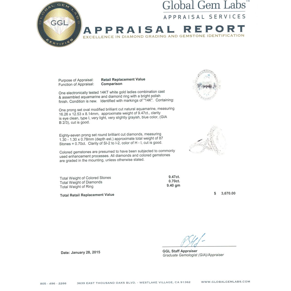 One electronically tested 14KT white gold ladies combination cast & assembled aquamarine and diamond ring with a bright polish finish. Identified with markings of "14K". Condition is new. Containing: One prong set oval modified brilliant cut natural aquamarine, measuring 16.26 x 12.53 x 8.14mm, approximate weight of 9.47ct., clarity is eye clean, type I, very light, very slightly grayish, blue color, (GIA B 2/3), cut is good. Eighty-Seven prong set round brilliant cut diamonds, measuring 1.30 - 1.30 x 0.78mm (depth est.) approximate total weight of 87 Stones = 0.70ct. Clarity: SI-2 to I-2. Color: H - I, Cut is Good. Colored gemstones are presumed to have been subjected to commonly used enhancement processes. All diamonds and colored gemstones are graded in the mounting, unless otherwise stated. Total Weight of Colored Stones 9.47ct. Total Weight of Diamonds 0.70ct. Total Weight of Ring 9.40 grams. GGL Appraised at $3,670.00.