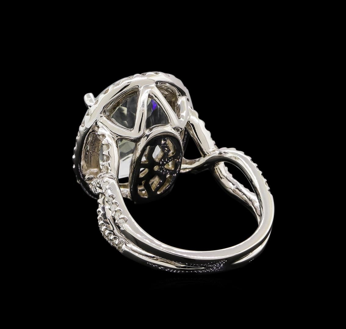 One electronically tested 14KT white gold ladies combination cast & assembled aquamarine and diamond ring with a bright polish finish. Identified with markings of "14K". Condition is new. Containing: One prong set oval modified brilliant cut natural aquamarine, measuring 16.26 x 12.53 x 8.14mm, approximate weight of 9.47ct., clarity is eye clean, type I, very light, very slightly grayish, blue color, (GIA B 2/3), cut is good. Eighty-Seven prong set round brilliant cut diamonds, measuring 1.30 - 1.30 x 0.78mm (depth est.) approximate total weight of 87 Stones = 0.70ct. Clarity: SI-2 to I-2. Color: H - I, Cut is Good. Colored gemstones are presumed to have been subjected to commonly used enhancement processes. All diamonds and colored gemstones are graded in the mounting, unless otherwise stated. Total Weight of Colored Stones 9.47ct. Total Weight of Diamonds 0.70ct. Total Weight of Ring 9.40 grams. GGL Appraised at $3,670.00.
