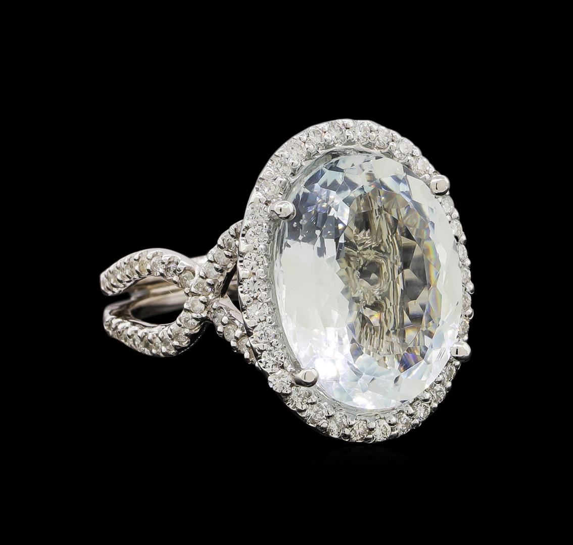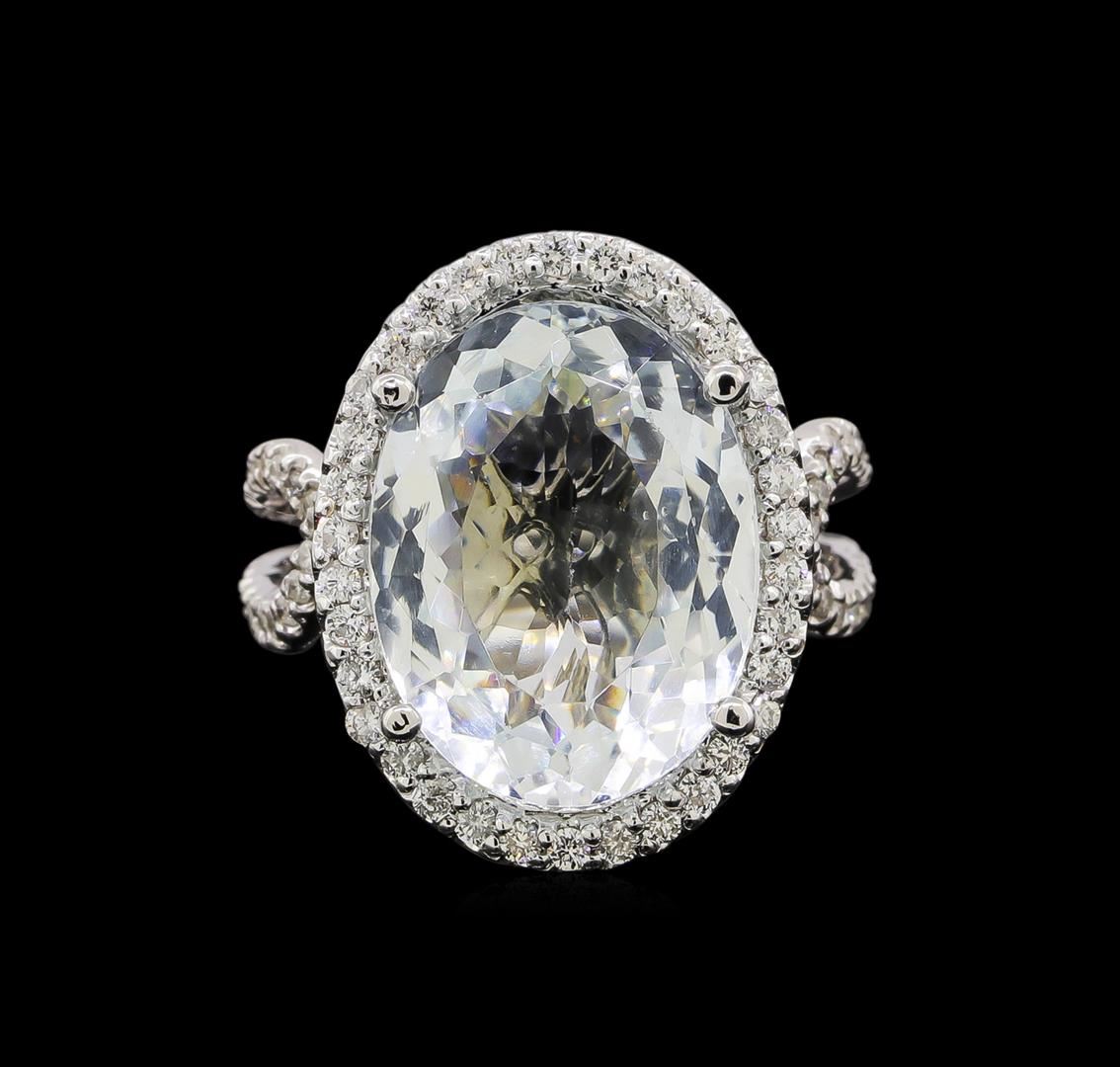 One electronically tested 14KT white gold ladies combination cast & assembled aquamarine and diamond ring with a bright polish finish. Identified with markings of "14K". Condition is new. Containing: One prong set oval modified brilliant cut natural aquamarine, measuring 16.26 x 12.53 x 8.14mm, approximate weight of 9.47ct., clarity is eye clean, type I, very light, very slightly grayish, blue color, (GIA B 2/3), cut is good. Eighty-Seven prong set round brilliant cut diamonds, measuring 1.30 - 1.30 x 0.78mm (depth est.) approximate total weight of 87 Stones = 0.70ct. Clarity: SI-2 to I-2. Color: H - I, Cut is Good. Colored gemstones are presumed to have been subjected to commonly used enhancement processes. All diamonds and colored gemstones are graded in the mounting, unless otherwise stated. Total Weight of Colored Stones 9.47ct. Total Weight of Diamonds 0.70ct. Total Weight of Ring 9.40 grams. GGL Appraised at $3,670.00.