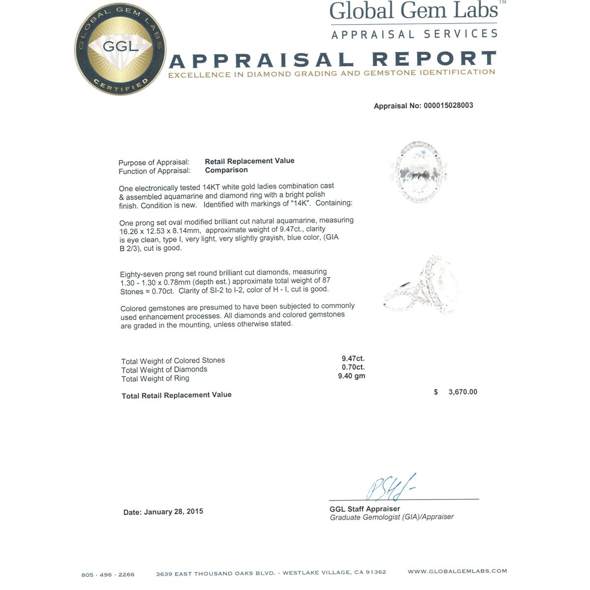 One electronically tested 14KT white gold ladies combination cast & assembled aquamarine and diamond ring with a bright polish finish. Identified with markings of "14K". Condition is new. Containing: One prong set oval modified brilliant cut natural aquamarine, measuring 16.26 x 12.53 x 8.14mm, approximate weight of 9.47ct., clarity is eye clean, type I, very light, very slightly grayish, blue color, (GIA B 2/3), cut is good. Eighty-Seven prong set round brilliant cut diamonds, measuring 1.30 - 1.30 x 0.78mm (depth est.) approximate total weight of 87 Stones = 0.70ct. Clarity: SI-2 to I-2. Color: H - I, Cut is Good. Colored gemstones are presumed to have been subjected to commonly used enhancement processes. All diamonds and colored gemstones are graded in the mounting, unless otherwise stated. Total Weight of Colored Stones 9.47ct. Total Weight of Diamonds 0.70ct. Total Weight of Ring 9.40 grams. GGL Appraised at $3,670.00.